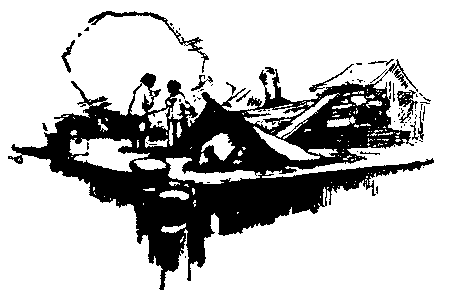 A thin strip of shadow huddled close to a pile of pearl shell at the end of the wharf, and I doubled myself up and attempted to sleep. But hardwood planks don't make an ideal resting place. Besides, the rays of sun followed the strip of shadow around the pile, and each time I slipped into a doze I would be pricked into wakefulness. At last, maddened by the biting rays, I collected half a dozen copra bags, splintered a piece of kauri pine, and after rigging up one bag as an awning, I spread the others on the planks and fell asleep.