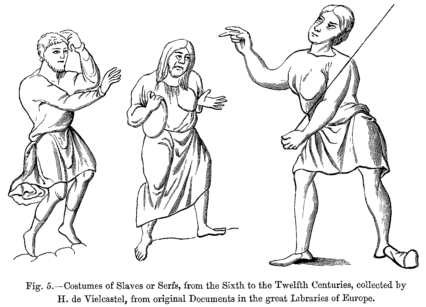 During the reign of the other Carlovingian kings, in the midst of political troubles, of internal wars, and of social disturbances, they had neither time nor inclination for inventing new fashions. Monuments of the latter part of the ninth century prove, indeed, that the national dress had hardly undergone any change since the time of Charlemagne, and that the influence of Roman tradition, especially on festive occasions, was still felt in the dress of the nobles (Figs. 408 to 411).