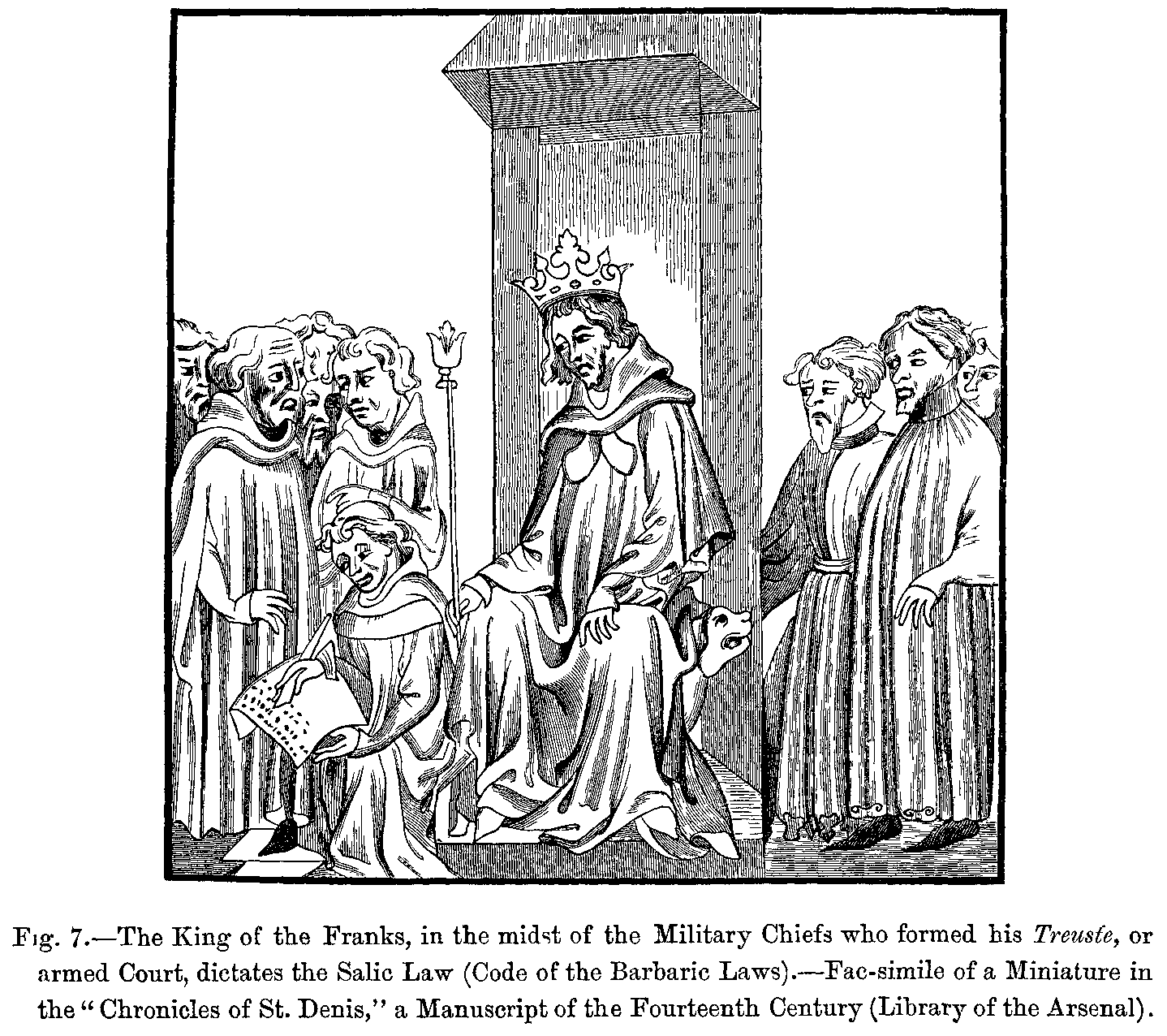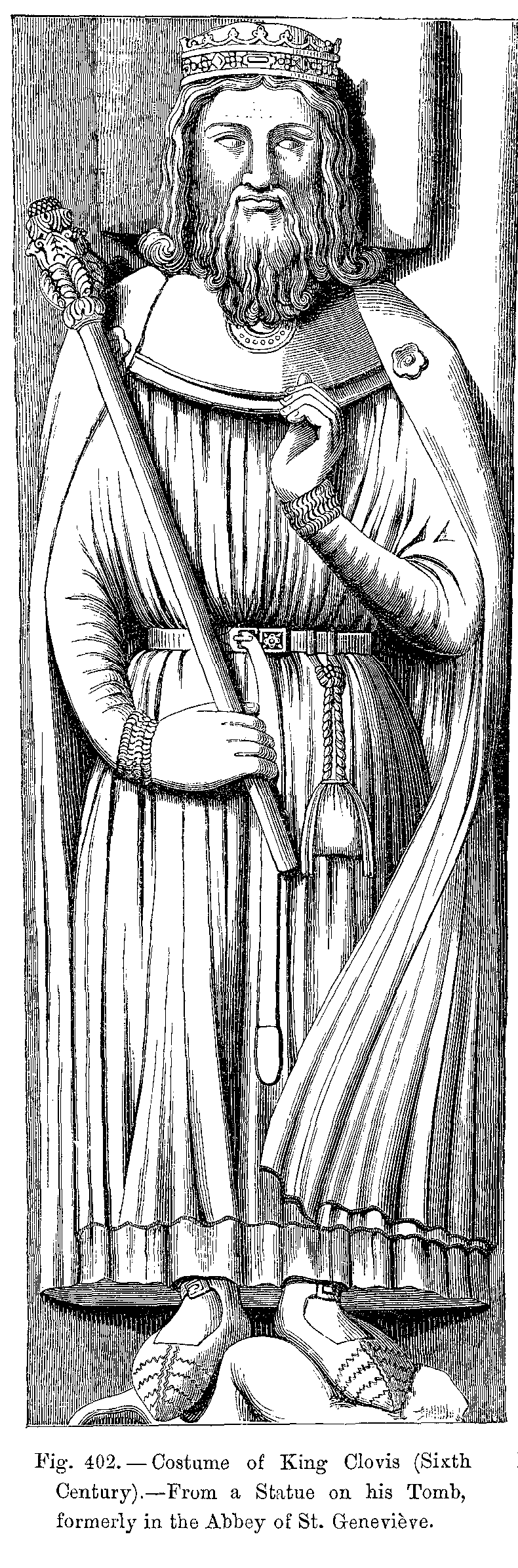 Fig. 402.--Costume of King Clovis (Sixth Century).--From a Statue on his Tomb, formerly in the Abbey of St. Geneviève.