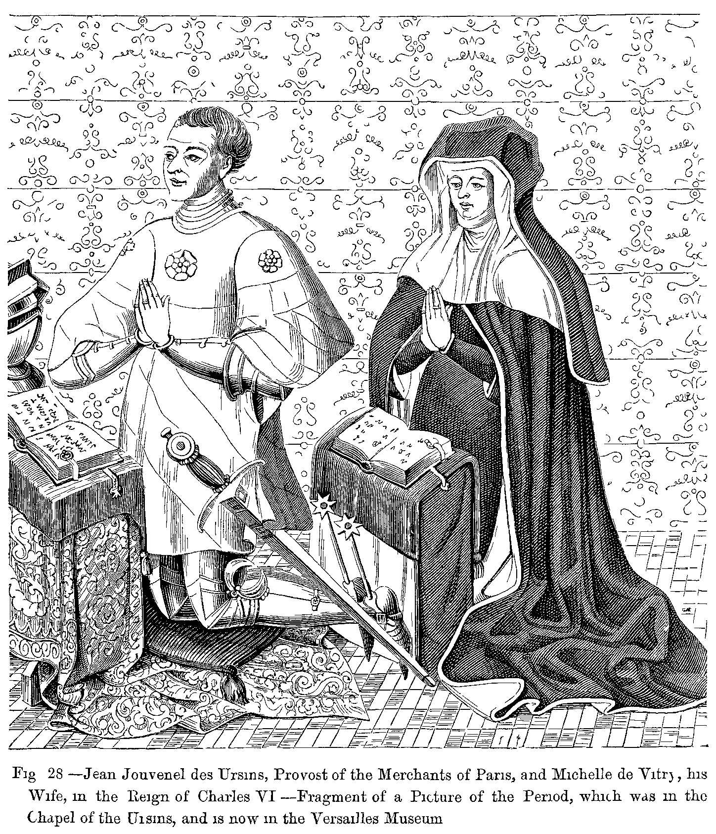 Fig. 432.--Costume of a rich Bourgeoise, and of a Noble, or Person of Distinction, of the Time of Francis I.--From a Window in the Church of St. Ouen at Rouen, by Gaignières (National Library of Paris).