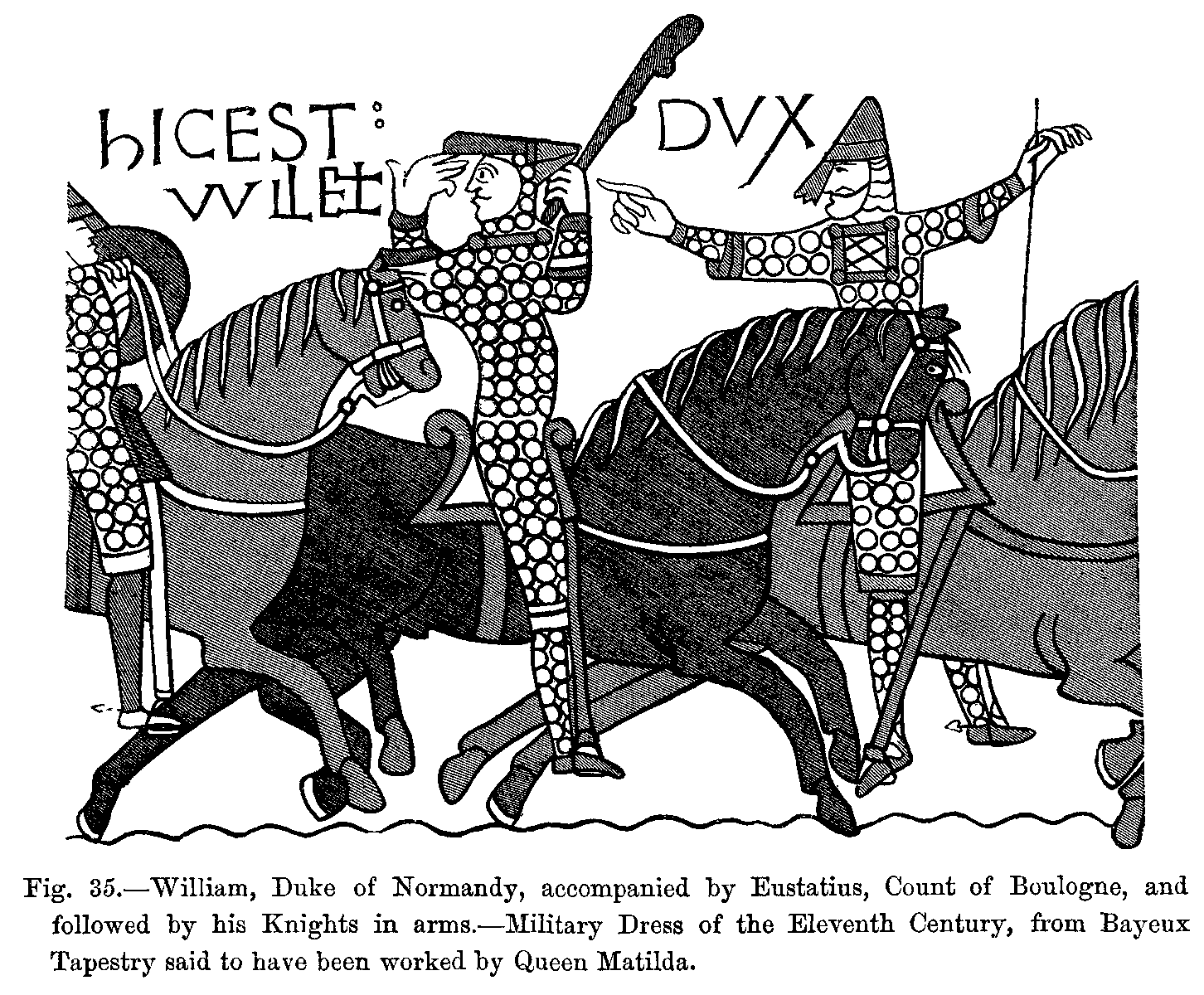 We cannot find that any very decided change was made in dress before the end of the eleventh century. The ordinary dress made of thick cloths and of coarse woollen stuffs was very strong and durable, and not easily spoiled; and it was usual, as we still find in some provinces which adhere to old customs, for clothes, especially those worn on festive occasions and at ceremonials, to be handed down as heirlooms from father to son, to the third or fourth generation. The Normans, who came from Scandinavia towards the end of the tenth century, A.D. 970, with their short clothes and coats of mail, at first adopted the dress of the French, and continued to do so in all its various changes. In the following century, having found the Saxons and Britons in England clad in the garb of their ancestors, slightly modified by the Roman style of apparel, they began to make great changes in their manner of dressing themselves. They more and more discarded Roman fashions, and assumed similar costumes to those made in France at the same period.