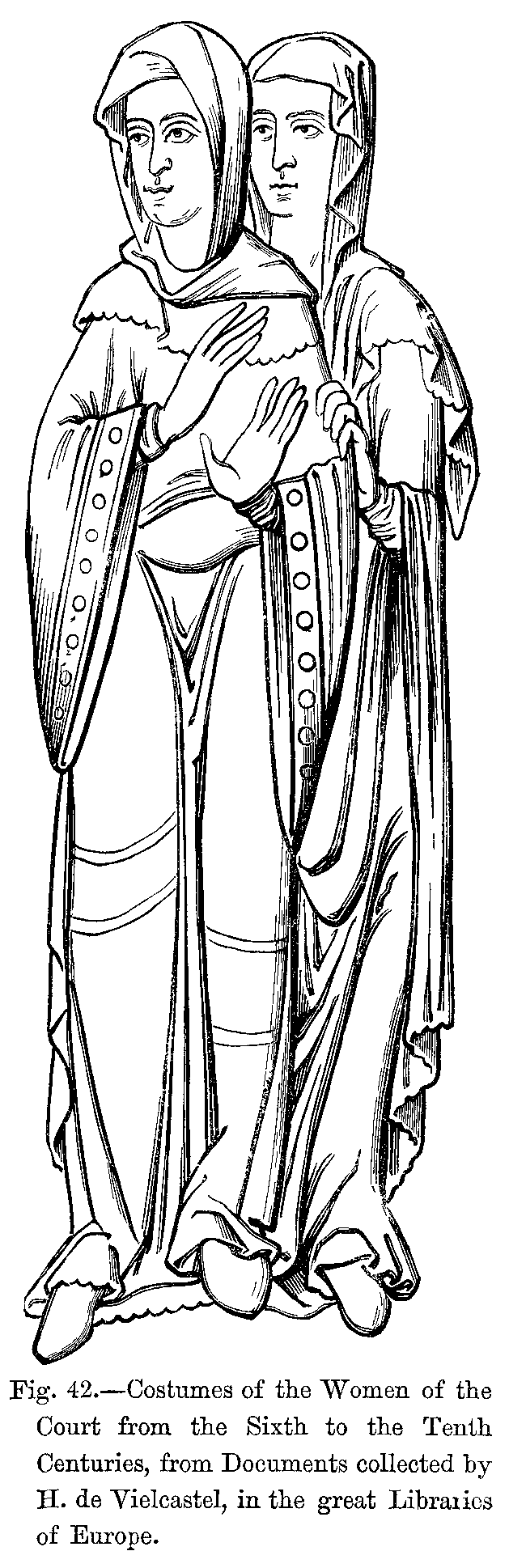 No great change was made in the dress of the two sexes during the tenth century. "Nothing was more simple than the head-dress of women," says M. Jules Quicherat; "nothing was less studied than their mode of wearing their hair; nothing was more simple, and yet finer, than their linen. The elegant appearance of their garments recalls that of the Greek and Roman, women. Their dresses were at times so tight as to display all the elegance of their form, whilst at others they were made so high as completely to cover the neck; the latter were called cottes-hardies. The cotte-hardie, which has at all times been part of the dress of French women, and which was frequently worn also by men, was a long tunic reaching to the heels, fastened in at the waist and closed at the wrists. Queens, princesses, and ladies of the nobility wore in addition a long cloak lined with ermine, or a tunic with or without sleeves; often, too, their dress consisted of two tunics, and of a veil or drapery, which was thrown over the head and fell down before and behind, thus entirely surrounding the neck."