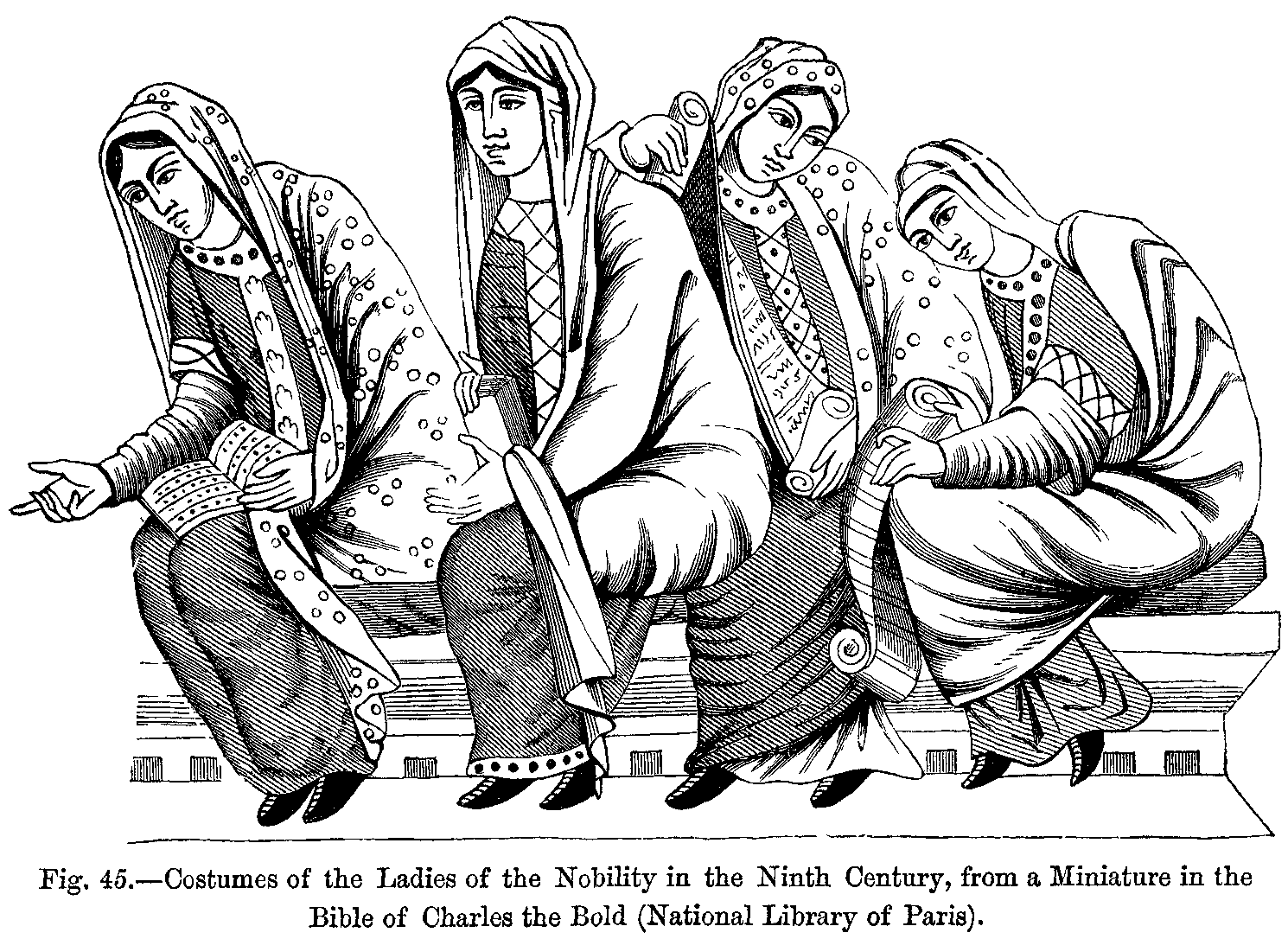 In a miniature of the large MS. Bible given by the canons of Saint-Martin of Tours in 869 to Charles the Bald (National Library of Paris), we find the King sitting on his throne surrounded by the dignitaries of his court, and by soldiers all dressed after the Roman fashion. The monarch wears a cloak which seems to be made of cloth of gold, and is attached to the shoulder by a strap or ribbon sliding through a clasp; this cloak is embroidered in red, on a gold ground; the tunic is of reddish brown, and the shoes are light red, worked with gold thread. In the same manuscript there is another painting, representing four women listening to the discourse of a prophet. From this we discover that the female costume of the time consisted of two tunics, the under one being longer but less capacious than the other, the sleeves of the former coming down tight to the wrists, and being plaited in many folds, whilst those of the latter open out, and only reach to the elbow. The lower part, the neck, and the borders of the sleeves are trimmed with ornamented bands, the waist is encircled by a girdle just above the hips, and a long veil, finely worked, and fastened on the head, covers the shoulders and hangs down to the feet, completely hiding the hair, so that long plaits falling in front were evidently not then in fashion. The under dress of these four women--who all wear black shoes, which were probably made of morocco leather--are of various colours, whereas the gowns or outer tunics are white.