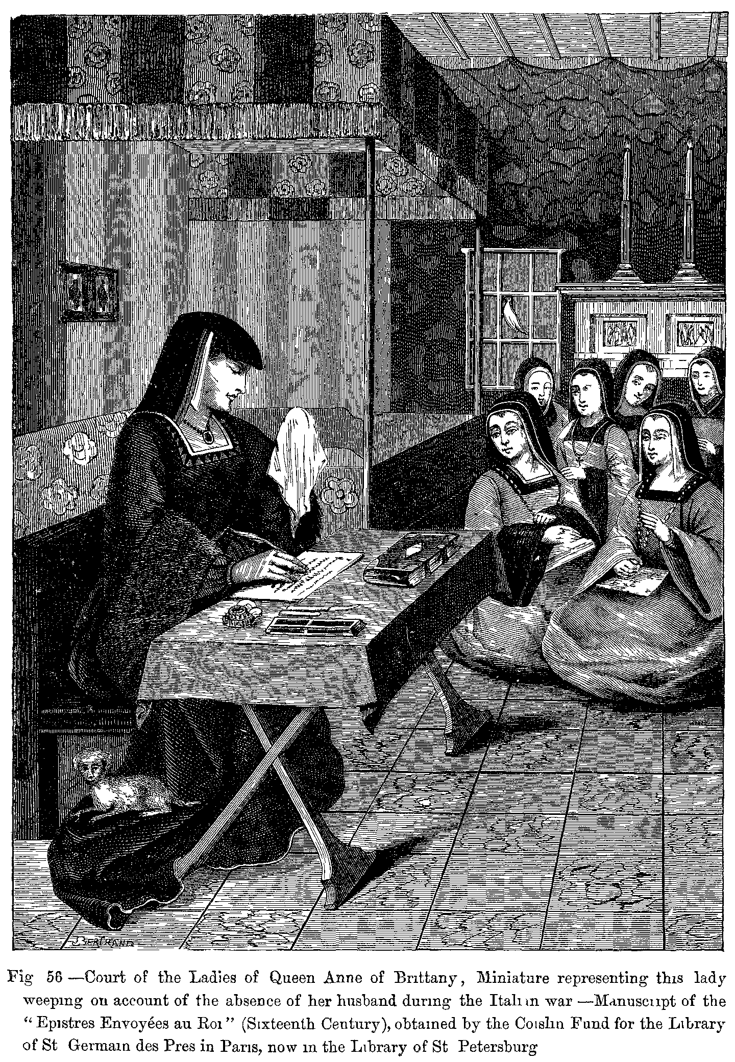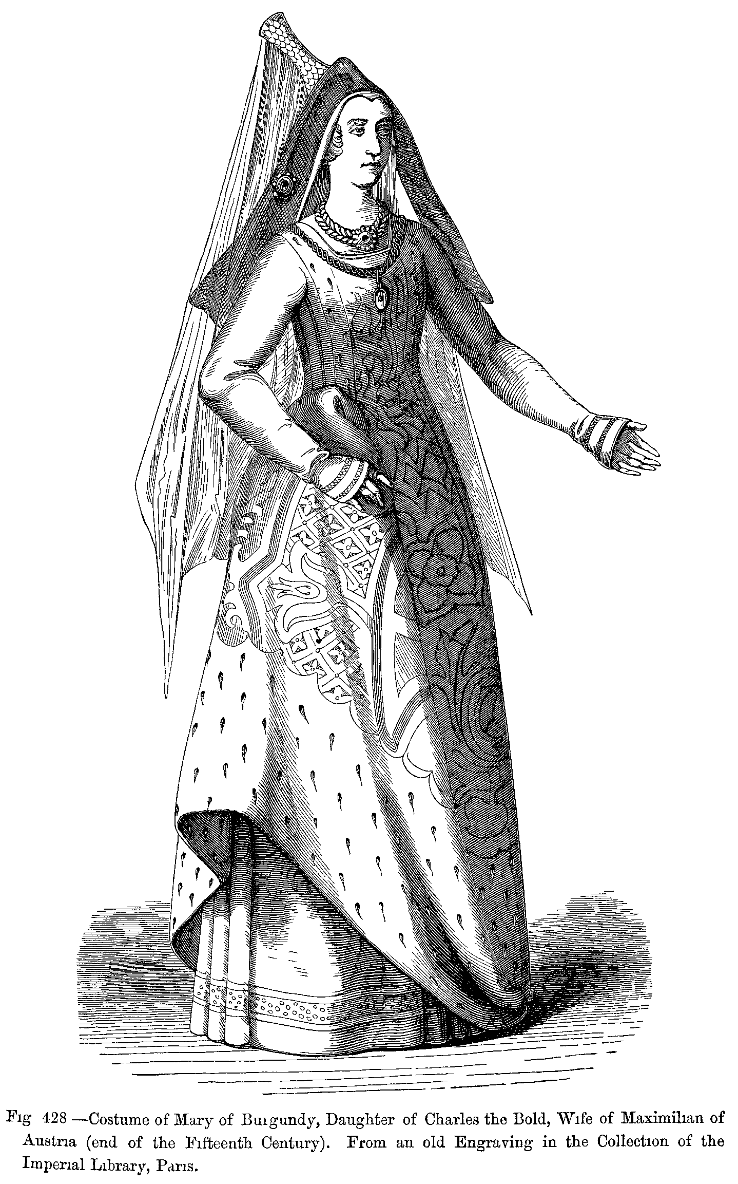 Fig. 428.--Costume of Mary of Burgundy, Daughter of Charles the Bold, Wife of Maximilian of Austria (end of the Fifteenth Century). From an old Engraving in the Collection of the Imperial Library, Paris.