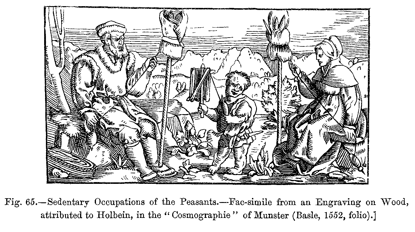 If we take a retrospective glance at the numerous changes of costume which we have endeavoured to describe in this hurried sketch, we shall find that amongst European nations, during the Middle Ages, there was but one common standard of fashion, which varied from time to time according to the particular custom of each country, and according to the peculiarities of each race. In Italy, for instance, dress always maintained a certain character of grandeur, ever recalling the fact that the influence of antiquity was not quite lost. In Germany and Switzerland, garments had generally a heavy and massive appearance; in Holland, still more so (Figs. 436 and 437). England uniformly studied a kind of instinctive elegance and propriety. It is a curious fact that Spain invariably partook of the heaviness peculiar to Germany, either because the Gothic element still prevailed there, or that the Walloon fashions had a special attraction to her owing to associations and general usage. France was then, as it is now, fickle and capricious, fantastical and wavering, but not from indifference, but because she was always ready to borrow from every quarter anything which pleased her. She, however, never failed to put her own stamp on whatever she adopted, thus making any fashion essentially French, even though she had only just borrowed it from Spain, England, Germany, or Italy. In all these countries we have seen, and still see, entire provinces adhering to some ancient costume, causing them to differ altogether in character from the rest of the nation. This is simply owing to the fact that the fashions have become obsolete in the neighbouring places, for every local costume faithfully and rigorously preserved by any community at a distance from the centre of political action or government, must have been originally brought there by the nobles of the country. Thus the head-dress of Anne of Brittany is still that of the peasant-women of Penhoét and of Labrevack, and the hennin of Isabel of Bavaria is still the head-dress of Normandy.
