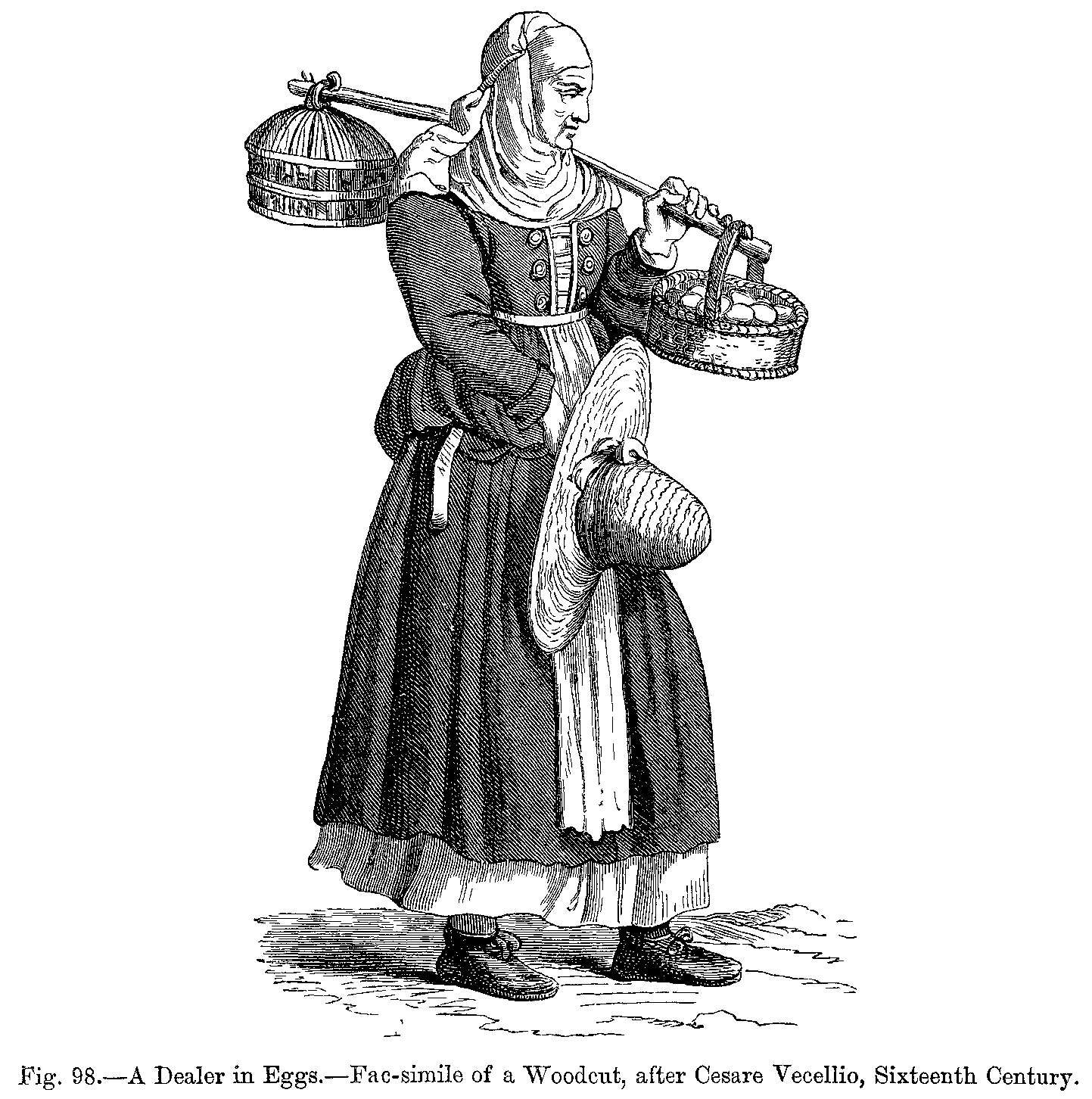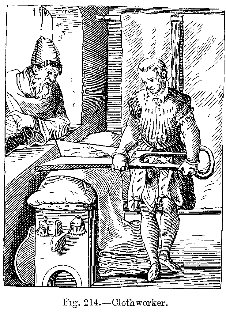 During the sixteenth century, ladies wore the skirts of their dresses, which were tight at the waist and open in front, very wide, displaying the lower part of a very rich under petticoat, which reached to the ground, completely concealing the feet. This, like the sleeves with puffs, which fell in circles to the wrists, was altogether an Italian fashion. Frequently the hair was turned over in rolls, and adorned with precious stones, and was surmounted by a small cap, coquettishly placed either on one side or on the top of the head, and ornamented with gold chains, jewels, and feathers. The body of the dress was always long, and pointed in front. Men wore their coats cut somewhat after the same shape: their trunk hose were tight, but round the waist they were puffed out. They wore a cloak, which only reached as far as the hips, and was always much ornamented; they carried a smooth or ribbed cap on one side of the head, and a small upright collar adorned the coat. This collar was replaced, after the first half of the sixteenth century, by the high, starched ruff, which was kept out by wires; ladies wore it still larger, when it had somewhat the appearance of an open fan at the back of the neck.