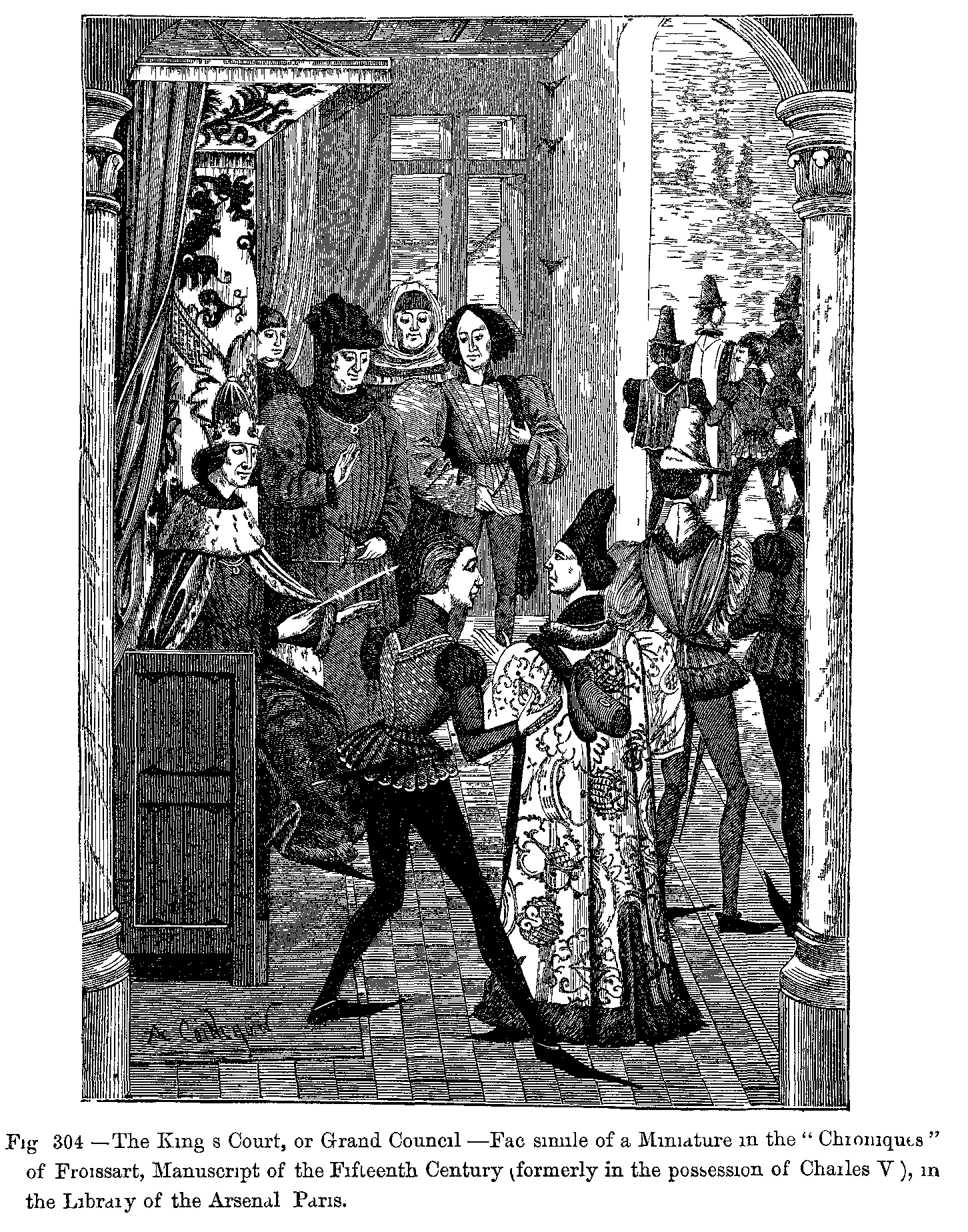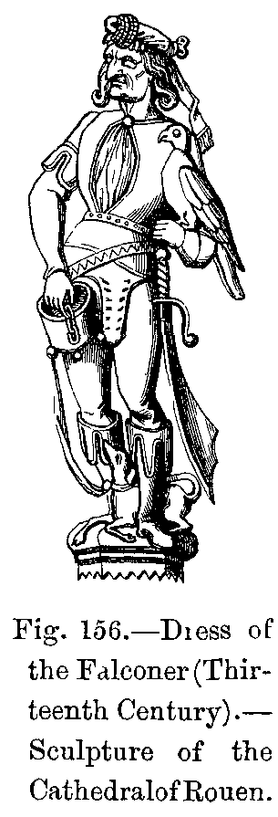 With the aid of our learned guide we have now reached a period (end of the thirteenth century) well adapted for this general study of the dress of our ancestors, inasmuch as soon afterwards men's dress at least, and especially that of young courtiers, became most ridiculously and even indecently exaggerated. To such an extent was this the case, that serious calamities having befallen the French nation about this time, and its fashions having exercised a considerable influence over the whole continent of Europe, contemporary historians do not hesitate to regard these public misfortunes as a providential chastisement inflicted on France for its disgraceful extravagance in dress.
