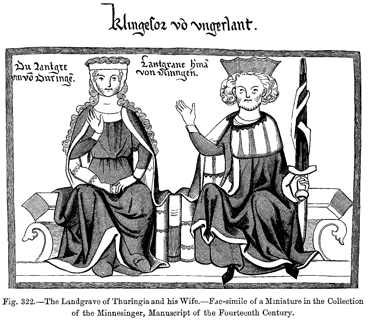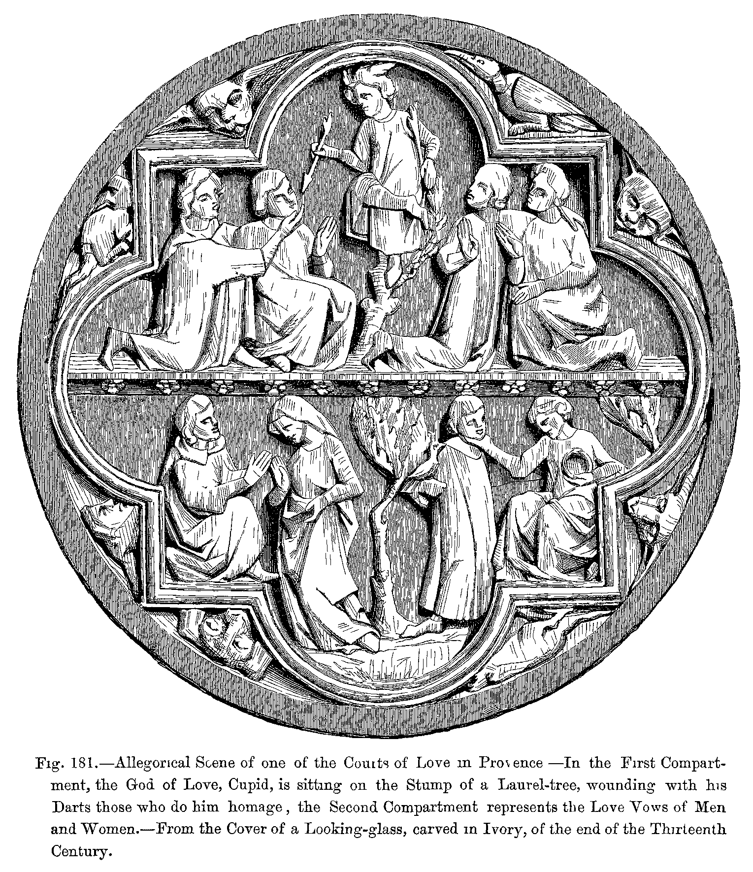 Fig. 416.--Costumes of the Thirteenth Century: Tristan and the beautiful Yseult.--From a Miniature in the Romance of "Tristan," Manuscript of the Fourteenth Century (Imperial Library of Paris).