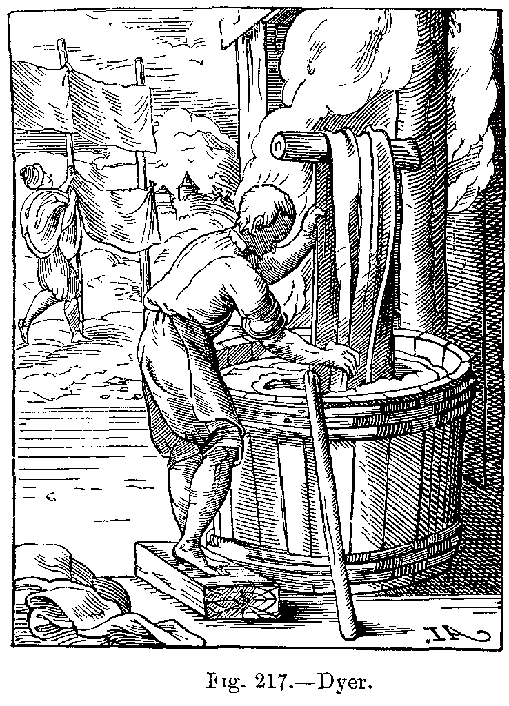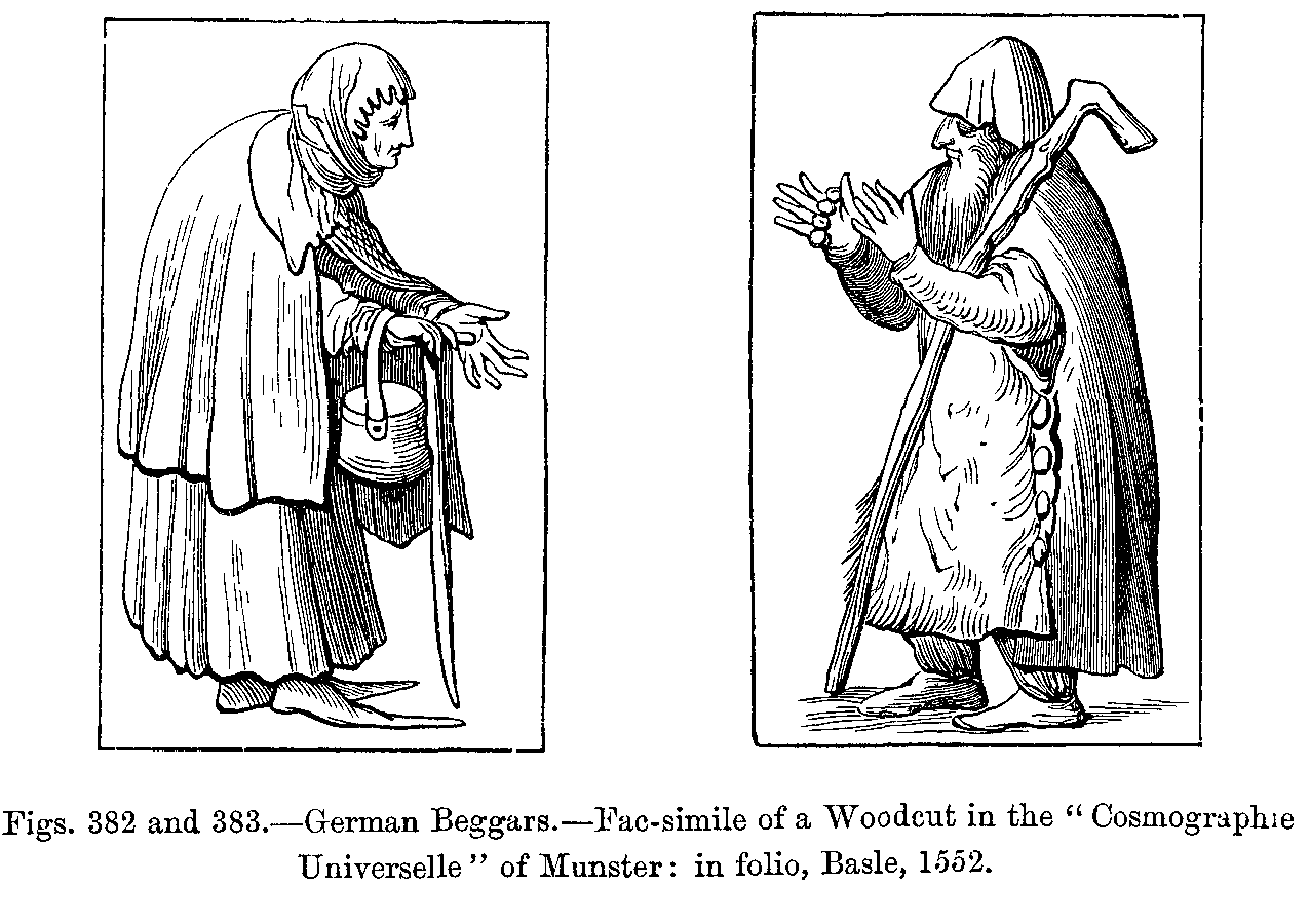 "Lastly, we have to mention the chape, which was always regarded as a necessary article of dress. The chape was the only protection against bad weather at a period when umbrellas and covered carriages were unknown. It was sometimes called chape de pluie, on account of the use to which it was applied, and it consisted of a large cape with sleeves, and was completely waterproof. It was borne behind a master by his servant, who, on account of this service was called a porte-chape. It is needless to say that the common people carried it themselves, either slung over their backs, or folded under the arm."