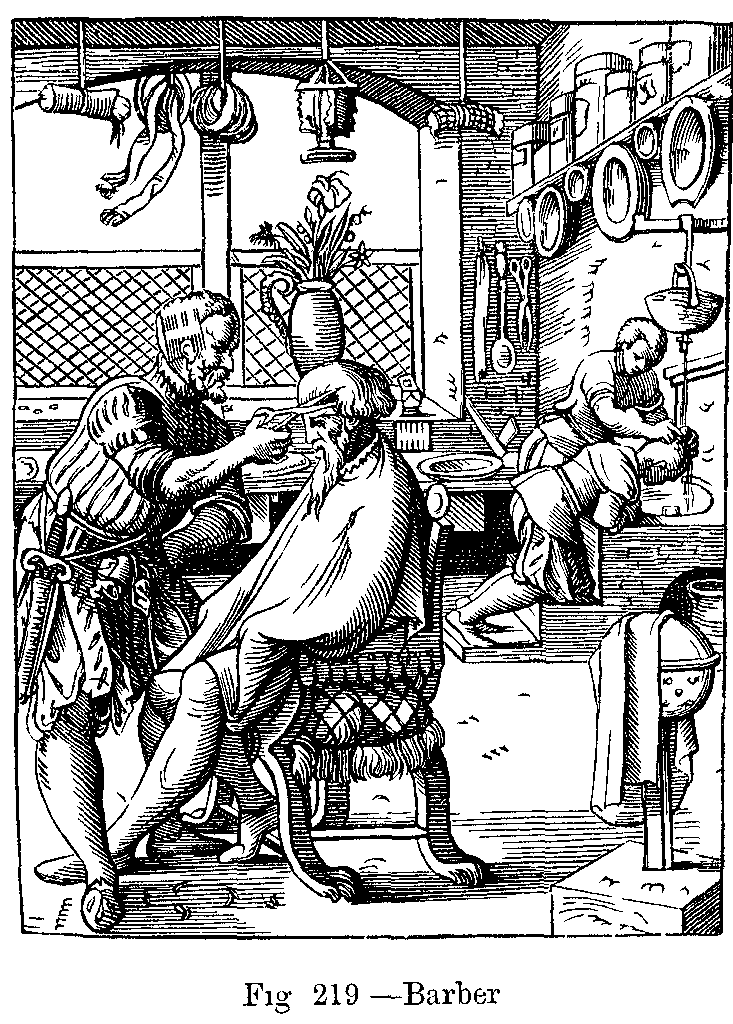 Whilst persons of rank were distinguished by their long and flowing hair, the people wore theirs more or less short, according to the degree of freedom which they possessed, and the serfs had their heads completely shaved. It was customary for the noble and free classes to swear by their hair, and it was considered the height of politeness to pull out a hair and present it to a person. Frédégaire, the chronicler, relates that Clovis thus pulled out a hair in order to do honour to St. Germer, Bishop of Toulouse, and presented it to him; upon this, the courtiers hastened to imitate their sovereign, and the venerable prelate returned home with his hand full of hair, delighted at the flattering reception he had met with at the court of the Frankish king. Durinig the Merovingian period, the greatest insult that could be offered to a freeman was to touch him with a razor or scissors. The degradation of kings and princes was carried out in a public manner by shaving their heads and sending them into a monastery; on their regaining their rights and their authority, their hair was always allowed to grow again. We may also conclude that great importance was attached to the preservation of the hair even under the kings of the second dynasty, for Charlemagne, in his Capitulaires, orders the hair to be removed as a punishment in certain crimes.