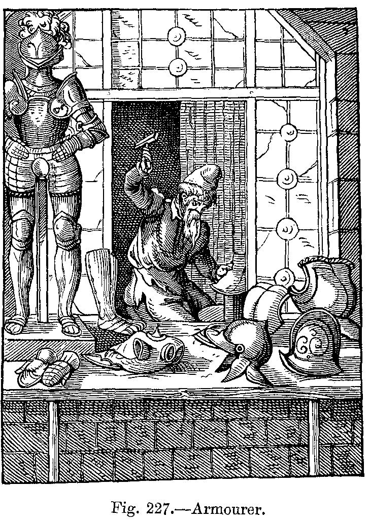 The surcoat (sur-cotte) was at first a garment worn only by females, but it was soon adopted by both sexes: it was originally a large wrapper with sleeves, and was thrown over the upper part of the robe (cotte), hence its name, sur-cotte. Very soon it was made without sleeves--doubtless, as M. Quicherat remarks, that the under garment, which was made of more costly material, might be seen; and then, with the same object, and in order that the due motion of the limbs might not be interfered with, the surcoat was raised higher above the hips, and the arm-holes were made very large.
