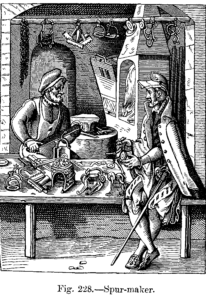 "The shoes were made of various kinds of leather, the quality of which depended on the way in which they were tanned, and were either of common leather, or of leather which was similar to that we know as morocco, and was called cordouan or cordua (hence the derivation of the word cordouannier, which has now become cordonnier). Shoes were generally made pointed; this fashion of the poulaines, or Polish points, was followed throughout the whole of Europe for nearly three hundred years, and, when first introduced, the Church was so scandalized by it that it was almost placed in the catalogue of heresies. Subsequently, the taste respecting the exaggerated length of the points was somewhat modified, but it had become so inveterate that the tendency for pointed shoes returning to their former absurd extremes was constantly showing itself. The pointed shoes became gradually longer during the struggles which were carried on in the reign of Philippe le Bel between Church and State.