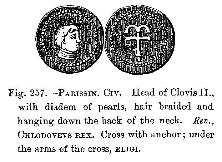 One great and characteristic difference between the Romans and the Franks should, however, be specially mentioned; namely, in the fashion of wearing the hair long, a fashion never adopted by the Romans, and which, during the whole of the first dynasty, was a distinguishing mark of kings and nobles among the Franks. Agathias, the Greek historian, says, "The hair is never cut from the heads of the Frankish kings' sons. From early youth their hair falls gracefully over their shoulders, it is parted on the forehead, and falls equally on both sides; it is with them a matter to which they give special attention." We are told, besides, that they sprinkled it with gold-dust, and plaited it in small bands, which they ornamented with pearls and precious metals.