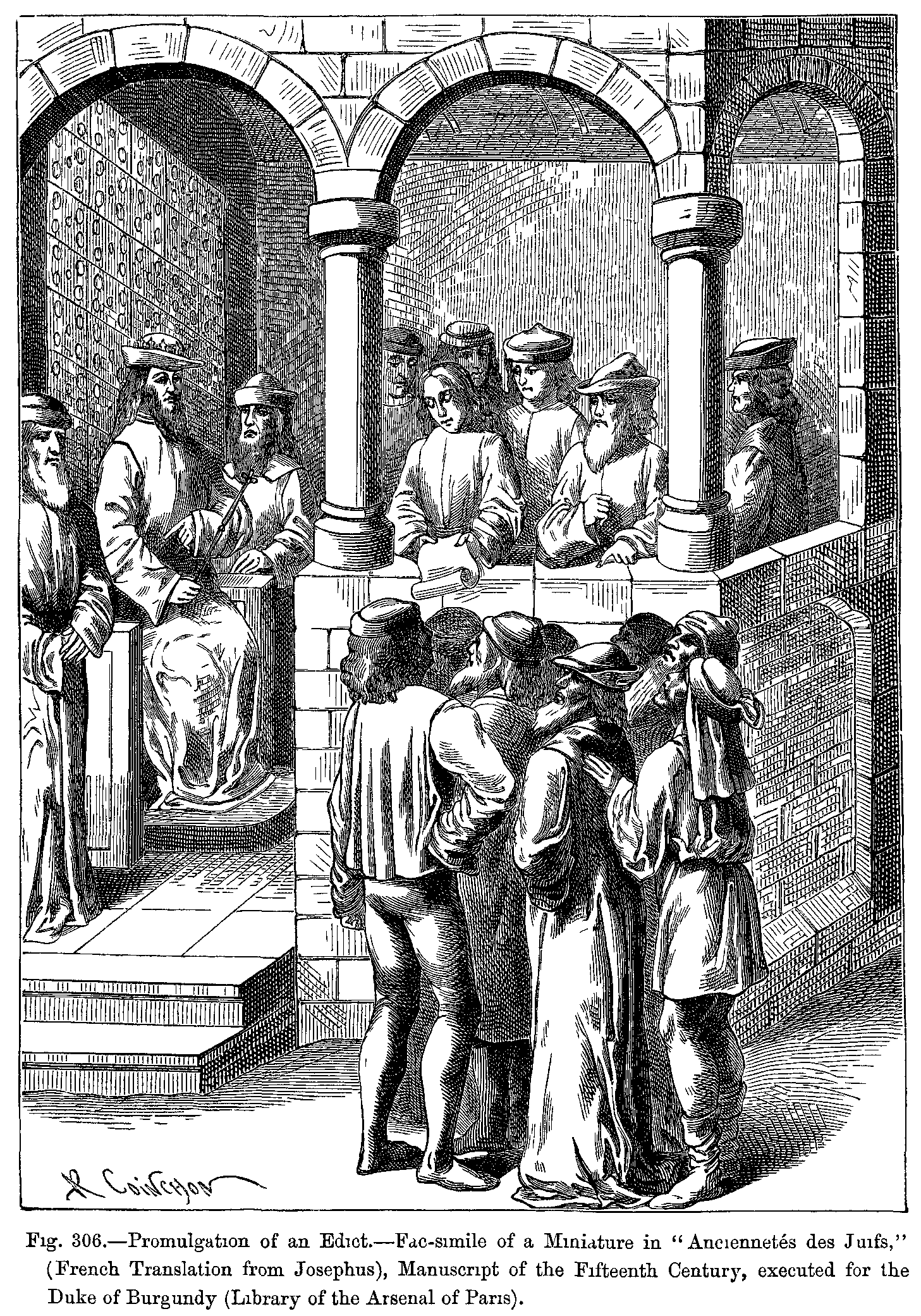 1. The Queen of Sheba before Solomon. Fac-simile of a Miniature from the Breviary of Cardinal Grimani, attributed to Memling. Costumes of the Fifteenth Century.