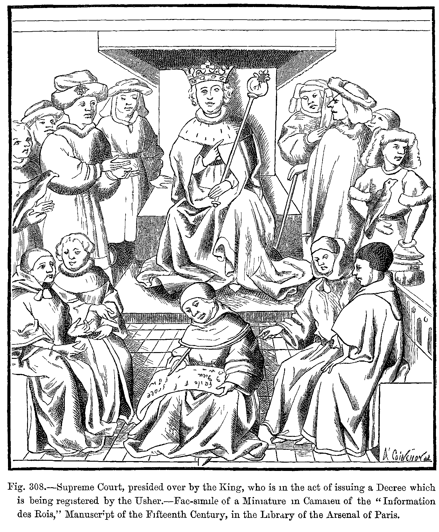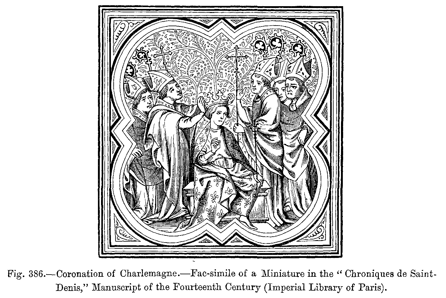 Fig. 411.--Costume of Charles the Simple (Tenth Century).--From a Miniature in the "Rois de France," by Du Tillet, Manuscript of the Sixteenth Century (Imperial Library of Paris).