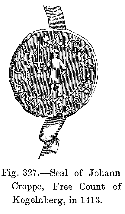 The Crusades also gave rise to the general use of the purse, which was suspended to the belt by a cord of silk or cotton, and sometimes by a metal chain. At the time of the Holy War, it had become an emblem characteristic of pilgrims, who, before starting for Palestine, received from the hands of the priest the cross, the pilgrim's staff, and the purse.