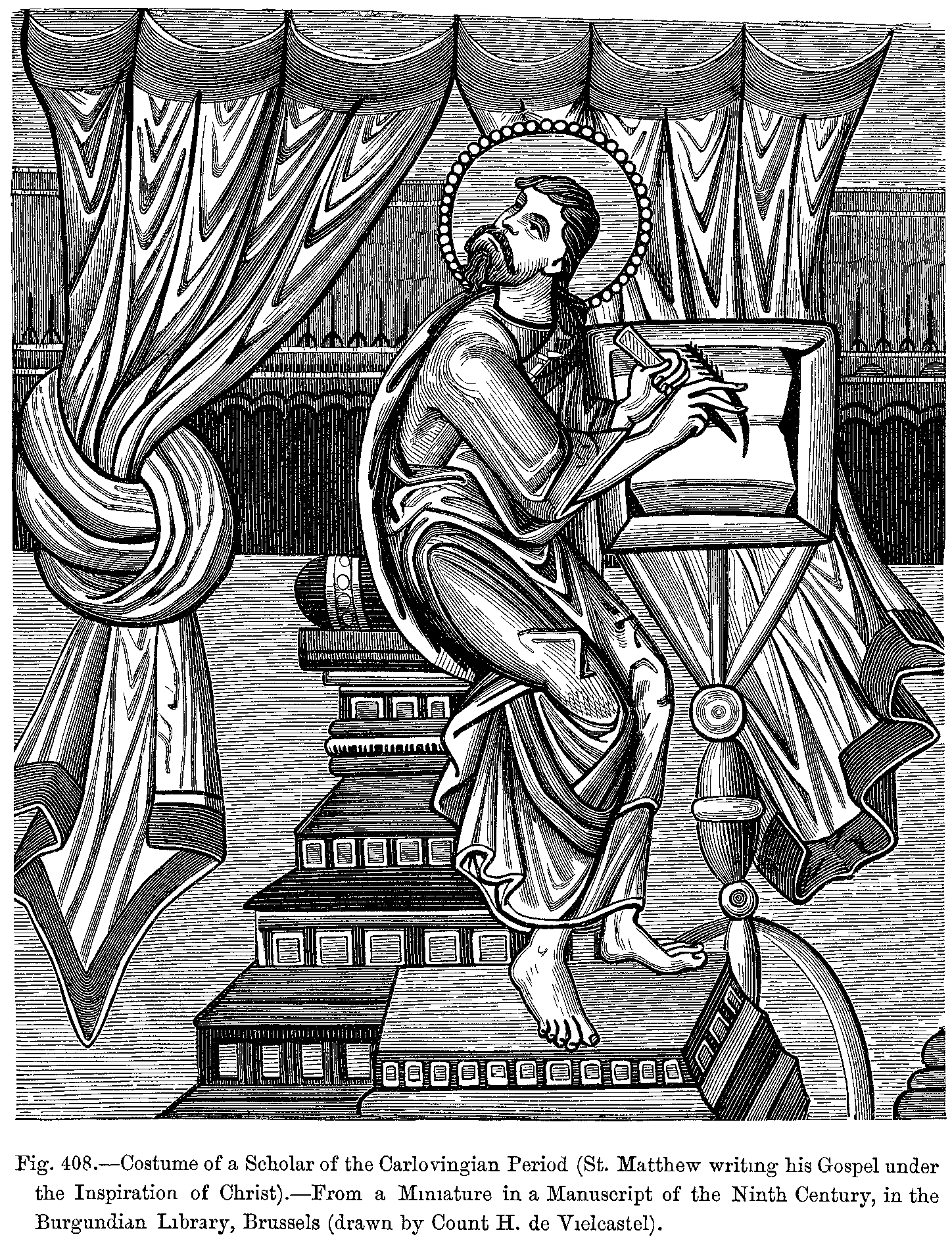 Fig. 408.--Costume of a Scholar of the Carlovingian Period (St. Matthew writing his Gospel under the Inspiration of Christ).--From a Miniature in a Manuscript of the Ninth Century, in the Burgundian Library, Brussels (drawn by Count H. de Vielcastel).