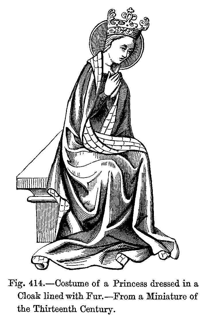 Fig. 414.--Costume of a Princess dressed in a Cloak lined with Fur.--From a Miniature of the Thirteenth Century.