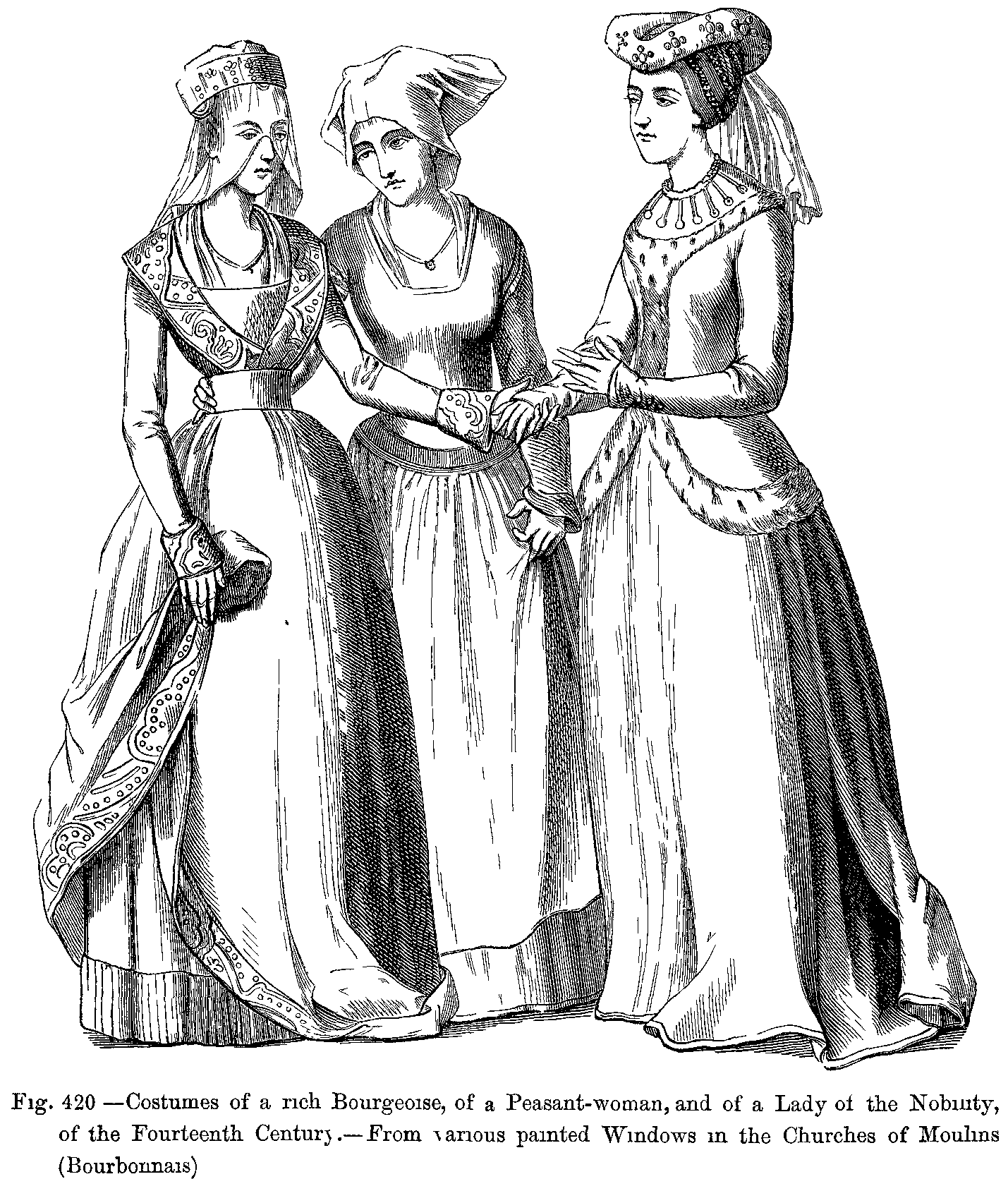 Fig. 420.--Costumes of a rich Bourgeoise, of a Peasant-woman, and of a Lady of the Nobility, of the Fourteenth Century.--From various painted Windows in the Churches of Moulins (Bourbonnais).