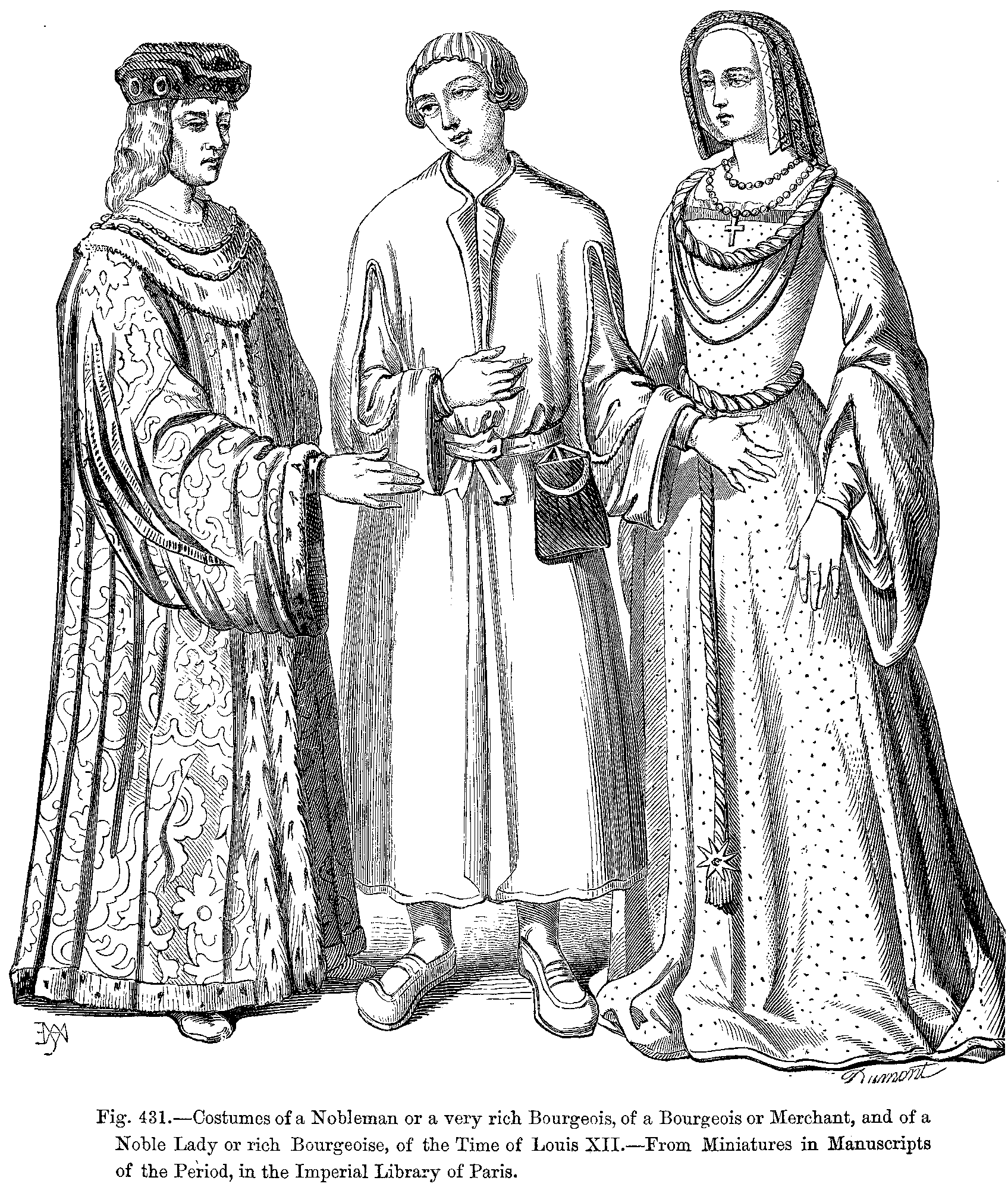 Fig. 431.--Costumes of a Nobleman or a very rich Bourgeois, of a Bourgeois or Merchant, and of a Noble Lady or rich Bourgeoise, of the Time of Louis XII.--From Miniatures in Manuscripts of the Period, in the Imperial Library of Paris.