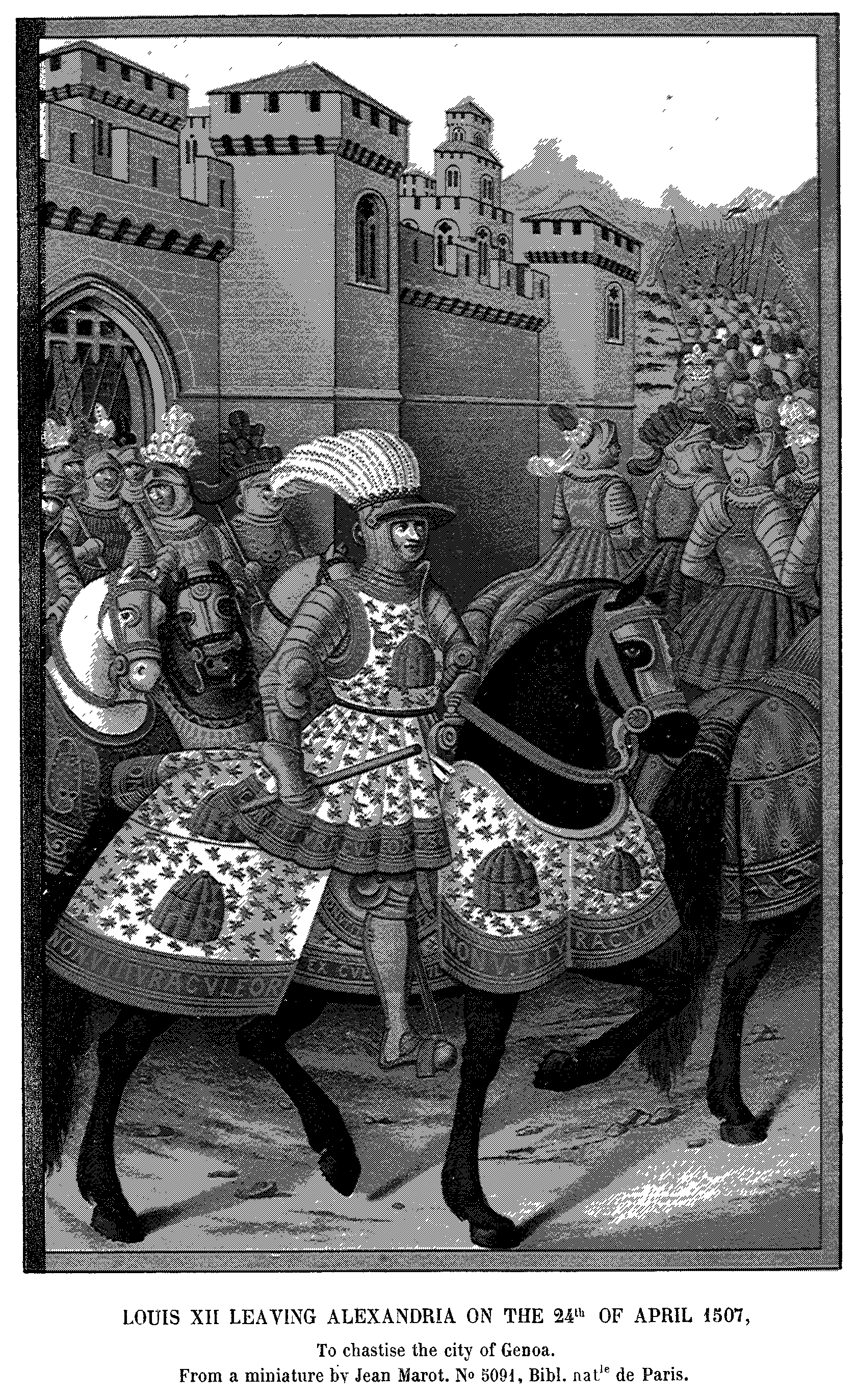 3. Louis XII. leaving Alexandria, on the 24th April, 1507, to chastise the City of Genoa. From a Miniature in the "Voyage de Gênes" of Jean Marot.
