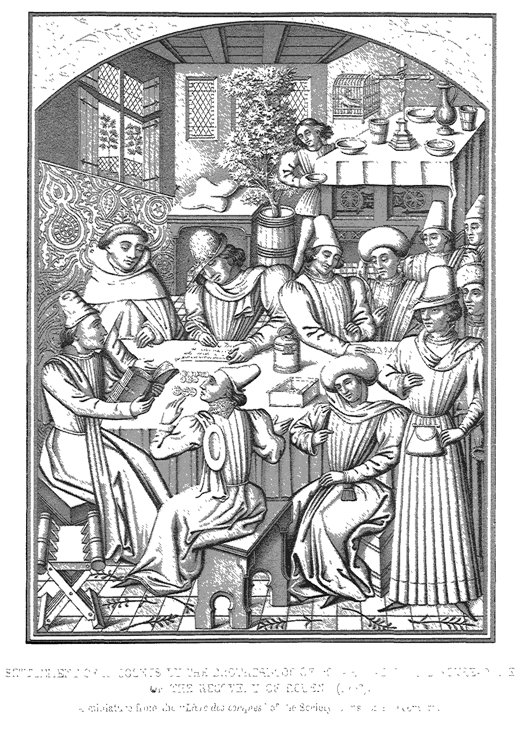 10. Settlement of Accounts by the Brotherhood of Charité-Dieu, Rouen, in 1466. A Miniature from the "Livre des Comptes" of this Society (Fifteenth Century).