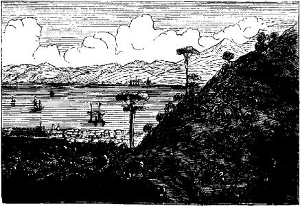 Une magnifique plage de sable, où la mer brise à peine, s'étend au loin avec complaisance, offrant toutes facilités au débarquement. Sur la droite, à l'extrémité de la plage, on distingue une église et un peu en arrière, à moitié côte, le télégraphe. Les deux navires ont le cap à terre. Vis-à-vis d'eux, on aperçoit la route royale qui longe la côte et une belle magnanerie dont les plantations vont en s'élevant par étages. L'habitation est au sommet du premier plateau derrière lequel s'élèvent en amphithéâtre une foule de points culminants étages les uns au-dessus des autres.