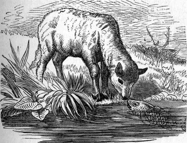"I beg you to observe," said the lamb, "that water does not commonly run uphill; and my sipping here cannot possibly defile the current where you are, even supposing my nose were no cleaner than yours, which it is. So you have not the flimsiest pretext for slaying me."