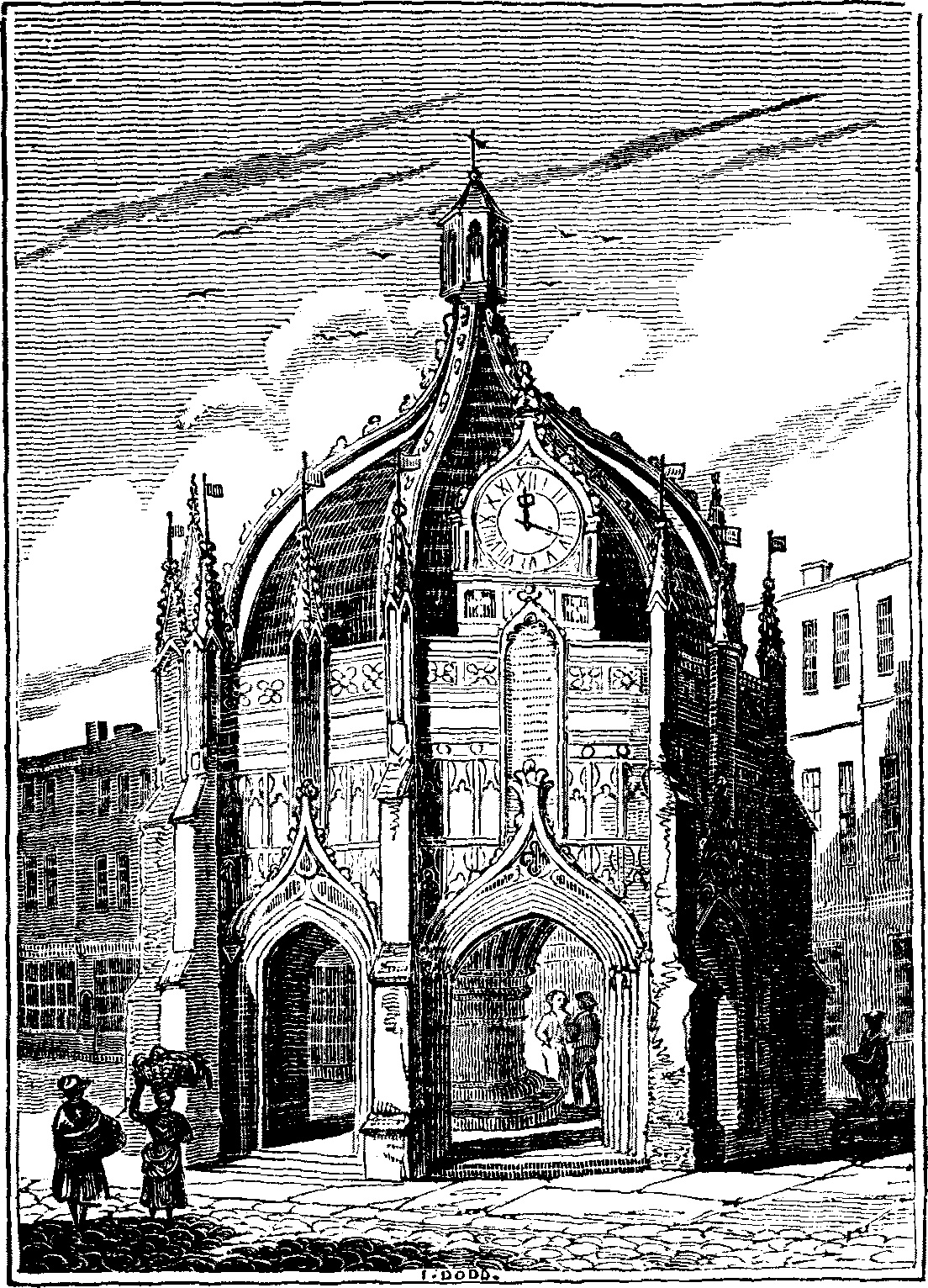 The Cross stands in the centre of the city, at the intersection of the four principal streets. According to the inscription upon it, this Cross was built by Edward Story, who was translated to this see from that of Carlisle, in 1475. It was repaired during the reign of Charles II., and at the expense of the Duke of Richmond, in 1746; though we are told that Bishop Story left an estate at Amberley, worth full 25l. per annum, to keep it in constant repair; but a few years afterwards the mayor and corporation sold it, in order to purchase another nearer home. The date of the erection of this structure is not mentioned in the inscription; but, from the style and ornaments, it must be referred to the time of Edward IV. This Cross is universally acknowledged to be one of the most elegant buildings of the kind existing in England. Its form is octangular, having a strong butment at each angle, surmounted with pinnacles. On each of its faces is an entrance through a pointed arch, ornamented with crockets and a finial. Above this, [pg 18] on four of its sides, is a tablet, to commemorate its reparation in the reign of Charles II. Above each tablet is a dial, exhibiting the hour to each of the three principal streets; the fourth being excluded from this advantage by standing at an angle. In the centre is a large circular column, the basement of which forms a seat: into this column is inserted a number of groinings, which, spreading from the centre, form the roof beautifully moulded. The central column appears to continue through the roof, and is supported without by eight flying buttresses, which rest on the several corners of the building. Till a few years since this Cross was used as a market-place; but the increased population of the city requiring a more extensive area for that purpose, a large and convenient market-house was, about the year 1807, erected in the North-street; on the completion of which, it was proposed to take down this Cross, then considered as a nuisance. Fortunately, however, the city was exempted from the reproach of such a proceeding by the public spirit of some of the members of the corporation, who purchased several houses on the north side of the Cross, in order to widen that part of the street, by their demolition.