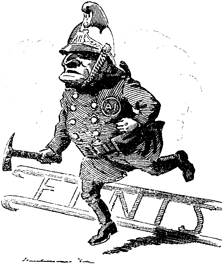 Why she should have taken this so personally—whether she thought he was alluding to her Narcissus-like complexion, or her wealth of luminous hair—I cannot say. At any rate—though I would not have it even whispered to poor little JIM, who, being far from well, had been quite unable to leave his sofa,—I say, at any rate, I, for one, felt convinced that the Princess had taken quite as much kümmel as was good for her, otherwise, how could any one, except my old friend ALICE DE VONDERLAND account for her urging the Three Men, already far gone, to go still farther, and to "Protect her honour," as she termed it, "by wiping out the insult offered to the NAPRAXINES!"