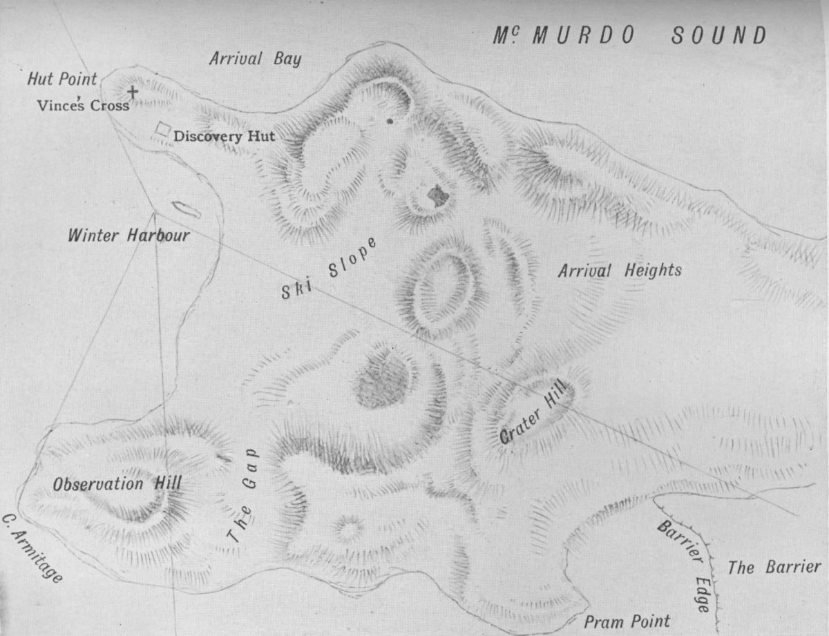 Observation Hill was clearly the place for it, it knew them all so well. Three of them were Discovery men who lived three years under its shadow: they had seen it time after time as they came back from hard journeys on the Barrier: Observation Hill and Castle Rock were the two which always welcomed them in. It commanded McMurdo Sound on one side, where they had lived: and the Barrier on the other, where they had died. No more fitting pedestal, a pedestal which in itself is nearly 1000 feet high, could have been found.