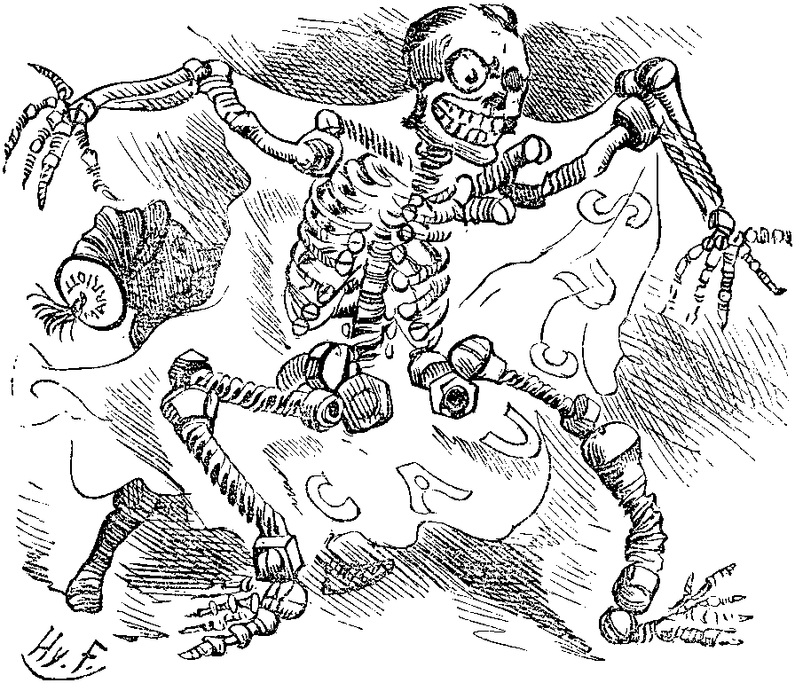 Dear Mr. Punch,—When writing to a Journal of light and leaders—or misleaders—last Friday, I kept "a little bit up my sleeve," so to speak, for the Brightest, Lightest, and Leadingest of all papers yclept the one, Sir, that bears your honoured name. After quoting from Mr. CHAMBERLAIN at Holloway (not in Holloway) on June 17, 1885, as a gentle reminder to Mr. GOSCHEN—their "Mr. G."—I observed, "Perhaps, however, there are reasons why the 'Egyptian Skeleton' prefers to forget the speeches of Mr. CHAMBERLAIN in 1885." It struck me that, having already an Egyptian Skeleton, we might have as its companion a Brummagem Skeleton, which everyone can see through, and this sketch I beg to submit to you, pro bono publico. Always, Mr. Punch, your most obedient "subject" (artistically),
