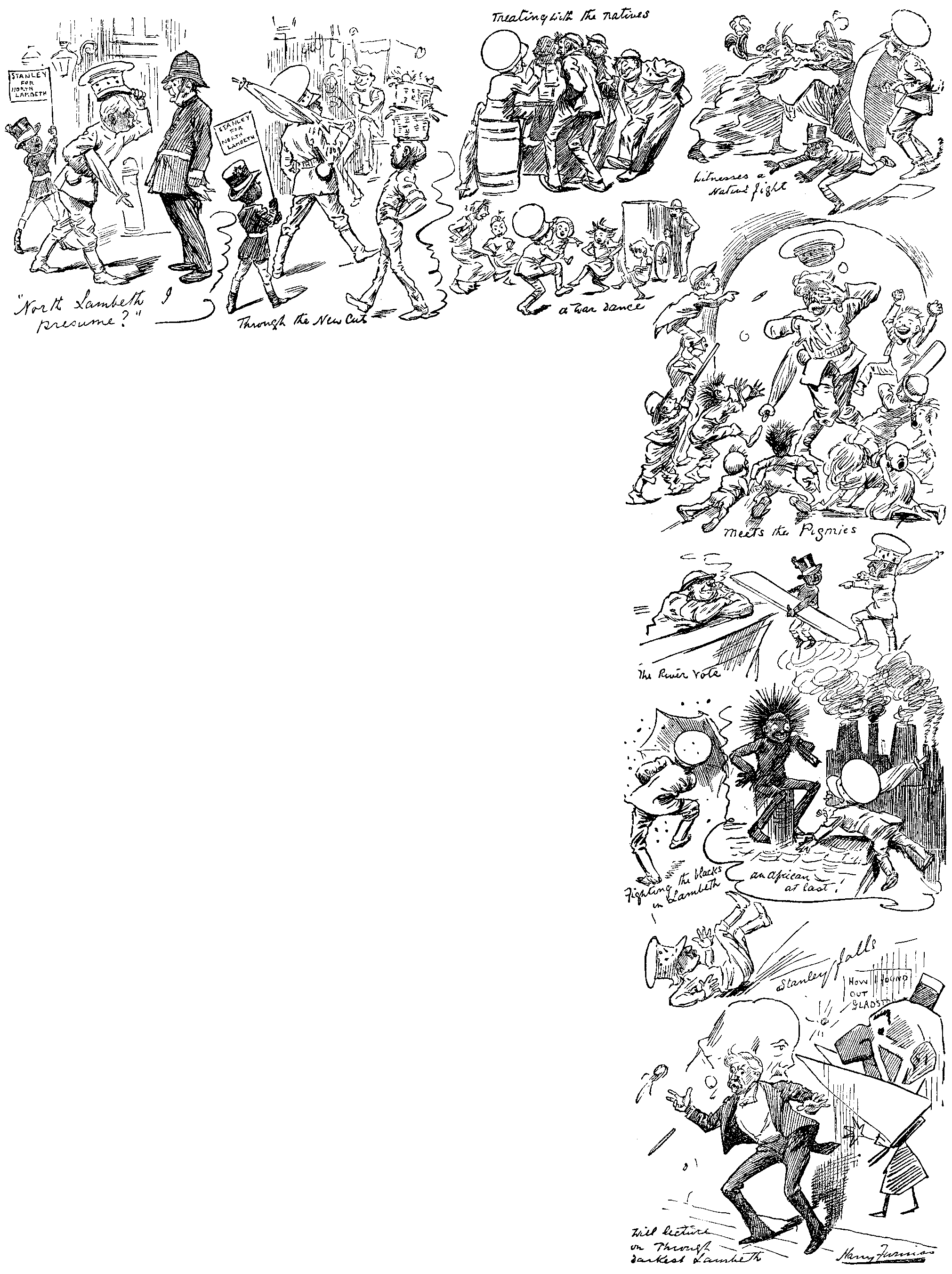 The Prof. (instructively). It is natural For a Horse when frightened at anything in Front of him, To jump Backwards, and when frightened at anything Back of him, To jump Forwards. (Applause, in recognition of the accuracy and observation of this axiom.) Now I will show you my method Of correcting this Tendency by means Of my double Safety Rope and driving Rein, without Cruelty. Always Be Humane, Never causing any Pain if you Possibly can Help it. Fetch that Harness. (The short Groom trips again, but so elaborately as to be immediately recognised as the funny man of the performance, after which his awkwardness ceases to entertain. The Professor shouts, "Woa!" and, as the horse declines to accept this suggestion, emphasises it by pulling the double rope, which, being attached to the animals forelegs, promptly brings him on his knees, much to his surprise and indignation.) Never use the word "Woa!" Only when you mean your horse To stop. Woa! (horse down again, intensely humiliated.) If you mean him just To go quiet, say "Steady!" and teach him The difference Of the words. Never afterwards Deceiving him. (Paterf. makes a note of this on Tartar's account.) Steady ... Woa! (Same business repeated; horse evidently feeling that he is the victim of a practical joke, and depressed. Finally, Professor says "Woa!" without pulling, and horse thinks it better to take the hint.)