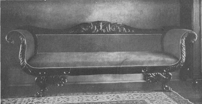 The change from Louis XVI to the Empire was a violent one both politically and artistically. The influence of the great days of the Roman empire and the mystery of ancient Egypt stirred Napoleon's imagination and formed his taste. Empire furniture was solid and heavy, with little or no carving, and much ornamentation of metal mounts. Mahogany was chiefly used, and some furniture was gilded or bronzed. Round columns finished with metal capitals and bases appeared on large desks and other pieces of furniture. Chairs were solid, many of them throne-like in design, and many with elaborately carved arms in the form of swans and sphinxes, and metal ornaments. The simpler form of chair, which was copied and used extensively in America, as a dining-chair, often had a curved back and graceful lines. Furniture coverings were very bright satins and velvets brocaded with the Emperor's favorite emblems, the bee, torch, wreath, anthemion. It is a heavy and gaudy style and must be used with great discretion. American Empire furniture was far simpler and is better suited to many American homes. In buying it, however, one must be careful to select copies from the earlier part of the time, for it fast deteriorated into heavy and vulgar curves. This American Empire furniture is often shown in the shops under the name of Colonial, which is a misnomer, as we had ceased to be colonies years before it came into existence. It was used during the first half of the nineteenth century.