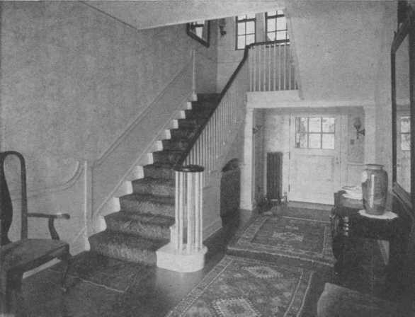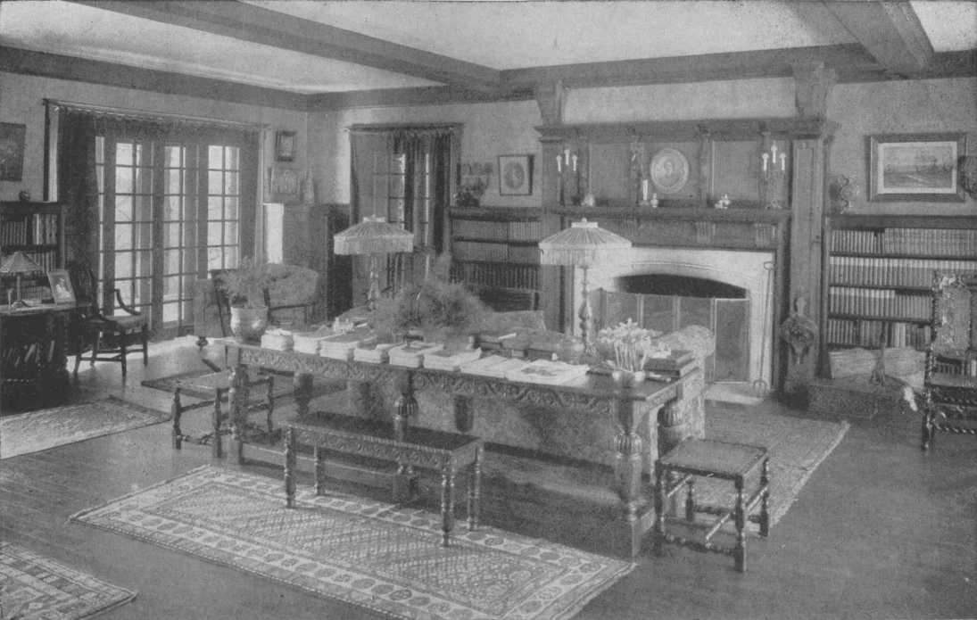 This is in reality a moderate-sized room, yet the open arrangement and the clear center give the impression of great space. The curve of the fireplace and the oak panelling are simple Tudor. The furniture is a mixture of many kinds.