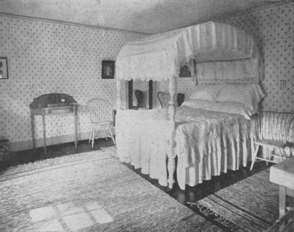 This fine well-curtained four poster, once the property of Lafayette, the trundle-bed, cradle, chairs and table, are all interesting, but the wallpaper appears to be of the ugly time of about 1880. Something more appropriate should be chosen.