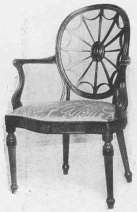 Hepplewhite's furniture has much of the delicacy of Adam's work, by whom, without doubt, he was influenced, as he was also by the French styles of the time. Luckily his own personality and sense of beauty and ingenuity were strong enough to develop a marked and beautiful style of his own. His favorite chair back was shield-shaped (see page 83), and he also used heart-shaped and wheel backs, either round or oval, and charmingly painted little panels. The three feathers of the Prince of Wales was a favorite design. He also made ladder-back chairs, usually with four rails. On much of his furniture the legs tapered on the inside edge only and were put in at a slight angle which gave security both in fact and appearance. He also used reeded legs. His console and other tables are beautiful in design and workmanship, being painted usually in different forms of the radiating fan design, or inlaid with beautiful colored woods. The inlay used was often oval in shape, sometimes only a line and sometimes panels of different woods or matched veneer. The handles used were round or oval. He made sofas and settees with either chair-back backs or all upholstered with the frame showing and the covering tacked on with brass tacks close together. His cabinets are fascinating, with their beautiful inlay and delicate strap work over the glass. He made four-post beds with fluted posts, and chests of drawers and little work tables and candle-stands and screens; and one thing we must be deeply grateful to him for is that he developed the sideboard into a really useful and beautiful piece of furniture. He made nearly everything in the way of necessities, and all show the marks of his taste. His dining-tables were on the plan of those of Chippendale but lighter in effect with tapering legs instead of the long cabriole leg ending in claw feet. His mirrors were usually oval with charming festoons. His favorite woods were mahogany and satin-wood, and he used many fine woods for inlay. Chintz and taffeta and fine velvet are all appropriate to use.