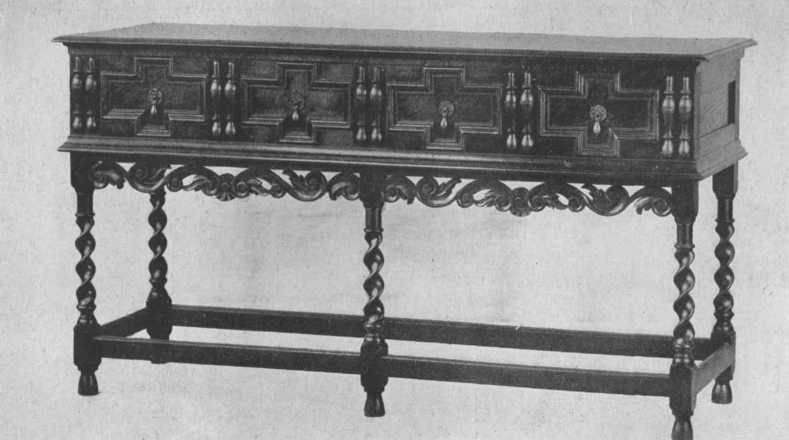 This Jacobean buffet is finely reproduced with the exception of the spiral carving of the legs, which is too sharp and thin, and gives the appearance of inadequate support. The split spindle ornament was much used on furniture of the period.
