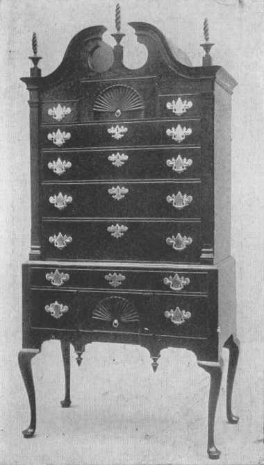 The general proportions, the broken pediment and torch or flame ornaments and drops, large brasses, and cabriole legs all show that this splendid example of a highboy belongs to the same time as the desk, about 1750.