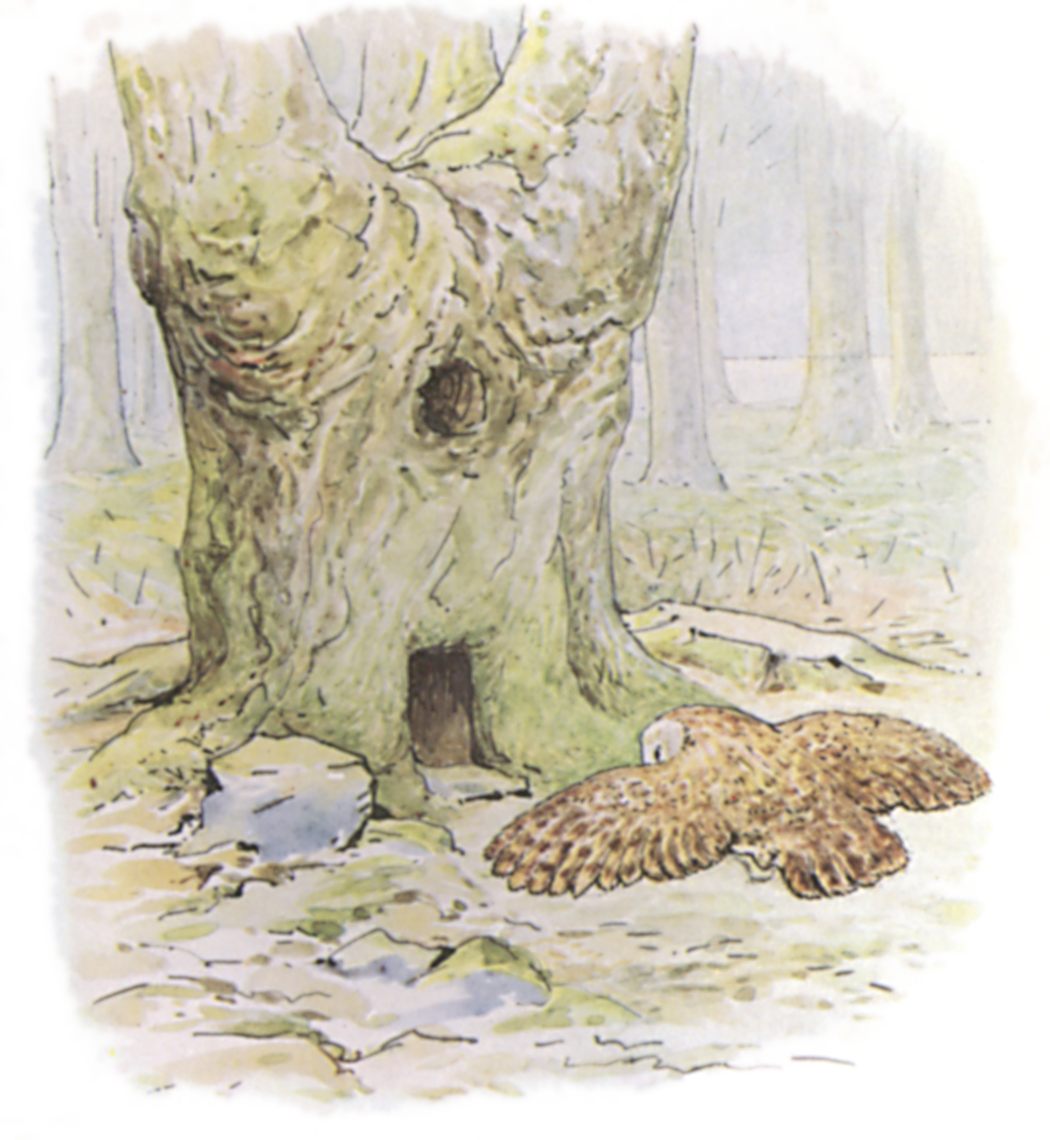 He shut the door in Nutkin's face. Presently a little thread of blue smoke from a wood fire came up from the top of the tree, and Nutkin peeped through the key-hole and sang—