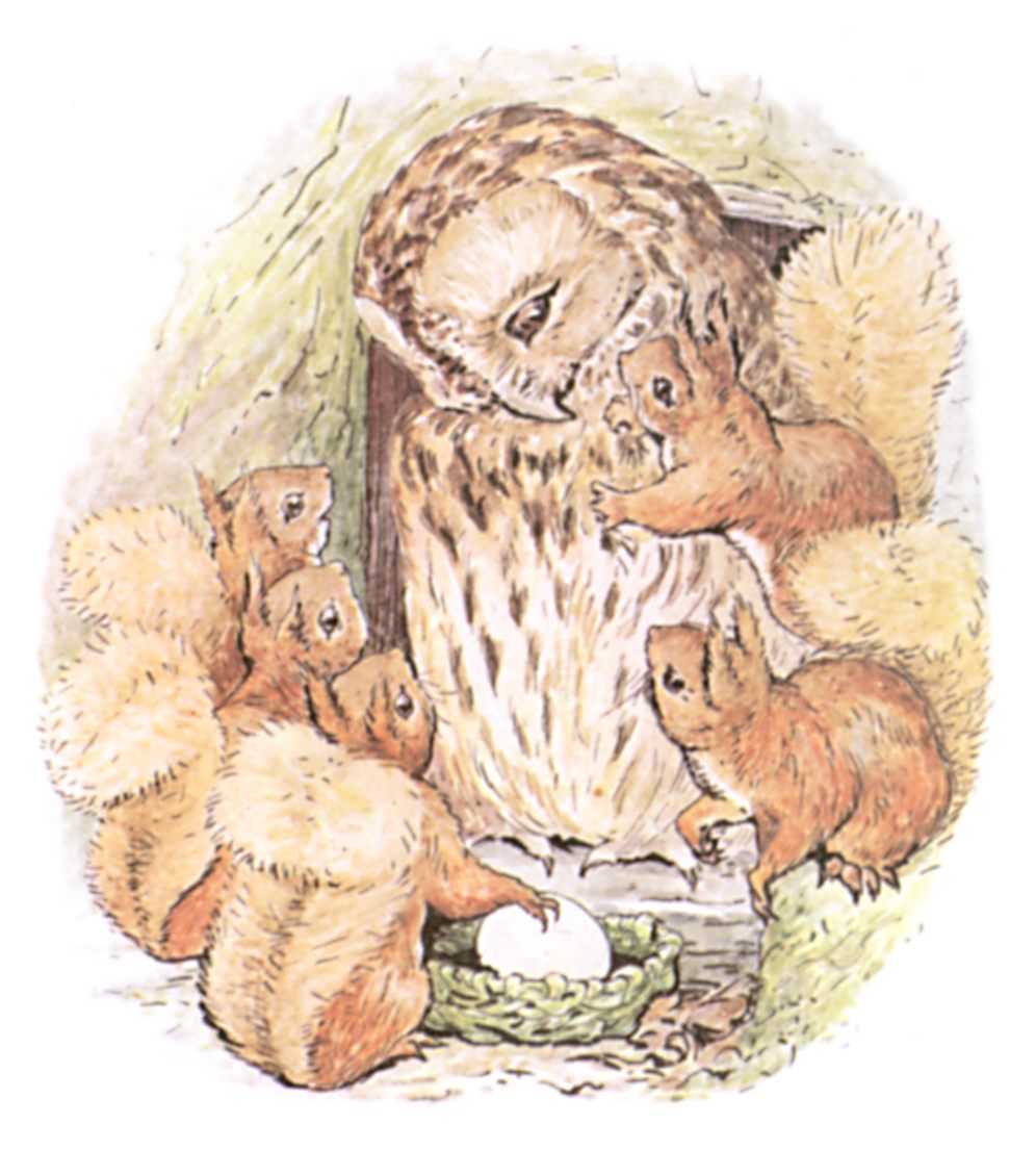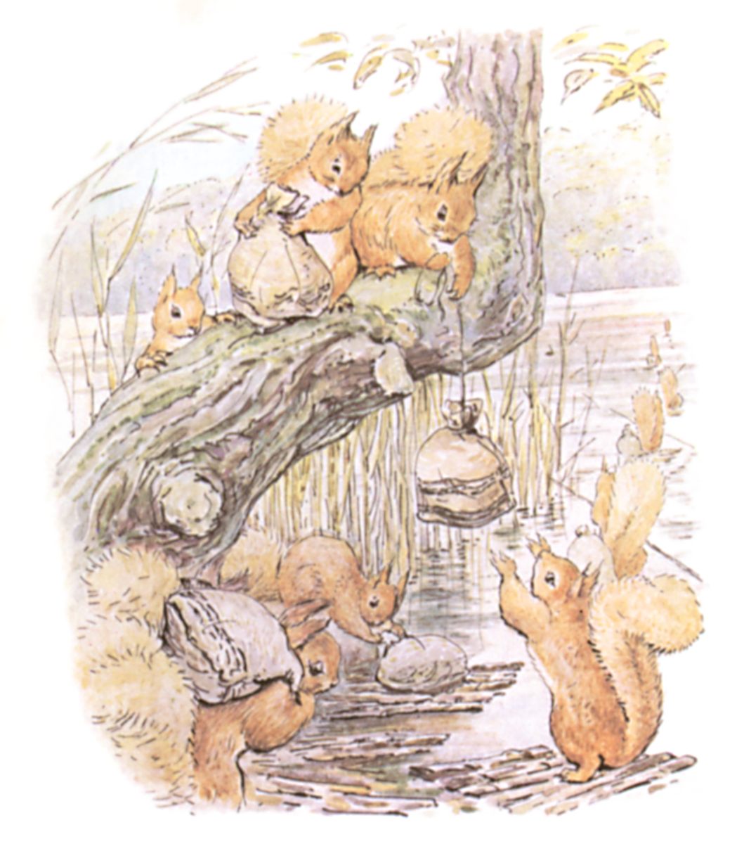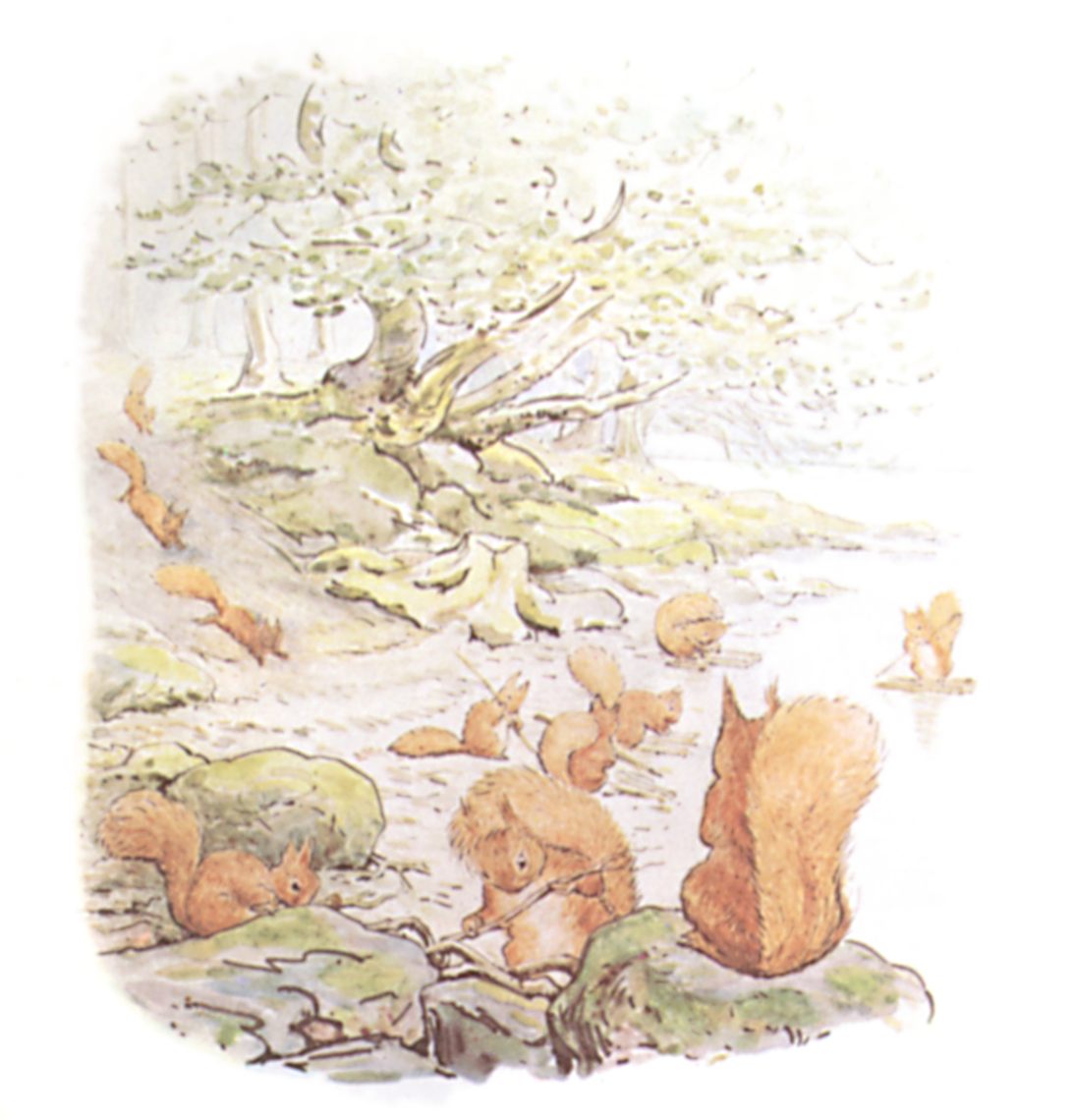 One autumn when the nuts were ripe, and the leaves on the hazel bushes were golden and green—Nutkin and Twinkleberry and all the other little squirrels came out of the wood, and down to the edge of the lake.