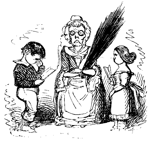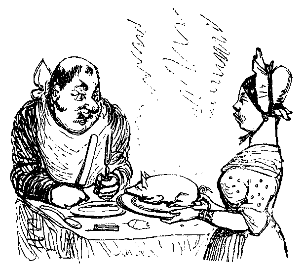 Agamemnon had nothing left but compliance with Mr. Smear’s demand; and one warming and three stew-pans, filled with live coals, were soon engaged in what Mr. Smear called the “ewaporating department.” As soon as the boards were sufficiently dry, Mr. Smear commenced operations. In each of the four corners of the room he described the diagram of a coral and bells, connecting them with each other by graceful festoons of blue-chalk ribbon tied in large true-lover’s knots in the centre. Having thus completed a frame, he proceeded, after sundry contortions of the facial muscles, to the execution of the great design. Having described an ellipse of red chalk, he tastefully inserted within it a perfect representation of the interior of an infant’s mouth in an early stage of dentition, whilst a graceful letter A seemed to keep the gums apart to allow of this artistical exhibition. Proudly did Mr. Smear cast his small grey eyes on Agamemnon, and challenge him, as it were, to a laudatory acknowledgment of his genius; but as his patron remained silent, Mr. Smear determined to speak out.