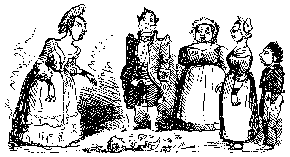 Entirely disgusted with his unsuccessful appeal to the enlightened British public assembled in the front of his residence, and which had produced effects so contrary to what he had conceived would be the result, Agamemnon called a committee of his household, to determine on the most advisable proceedings to be adopted for remedying the evils resulting from the unexpected pyrotechnic display of the morning. The carpet was spoiled—the house was impregnated with the sooty effluvia, and the company was expected to arrive at nine o’clock. What was to be done? Betty suggested the burning of brown paper and scrubbing the carpet; John, assafœtida and sawdust; Mrs. Waddledot, pastilles and chalking the floor. As the latter remedies seemed most compatible with the gentility of their expected visiters, immediate measures were taken for carrying them into effect. A dozen cheese-plates were disposed upon the stairs, each furnished with little pyramids of fragrance; old John, who was troubled with an asthma, was deputed to superintend them, and nearly coughed himself into a fit of apoplexy in the strenuous discharge of his duty.