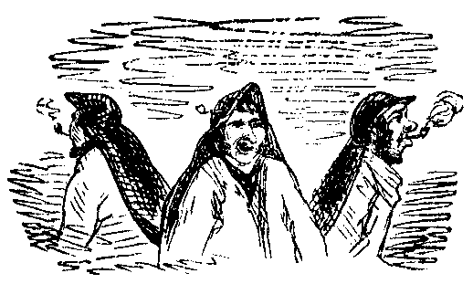 Arrived at their lodgings, the party throw off all restraint. The table is soon covered with beer, spirits, screws, hot water, and pipes; and the company take off their coats, unbutton their stocks, and proceed to conviviality. Mr. Muff, who is in the chair, sings the first song, which informs his friends that the glasses sparkle on the board and the wine is ruby bright, in allusion to the pewter-pots and half-and half. Having finished, Mr. Muff calls upon Mr. Jones, who sings a ballad, not altogether perhaps of the same class you would hear at an evening party in Belgrave-square, but still of infinite humour, which is applauded upon the table to a degree that flirps all the beer out of the pots, with which Mr. Rapp draws portraits and humorous conceits upon the table with his finger. Mr. Manhug is then called upon, and sings