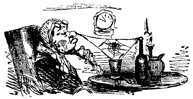 The first symptom of approaching cerebral excitement from the action of liquid stimulants is perceived in Mr. Muff himself, who tries to cut some cold meat with the snuffers. Mr. Simpson also, a new man, who is looking very pale, rather overcome with the effects of his elementary screw in a first essay to perpetrate a pipe, petitions for the window to be let down, that the smoke, which you might divide with a knife, may escape more readily. This proposition is unanimously negatived, until Mr. Jones, who is tilting his chair back, produces the desired effect by overbalancing himself in the middle of a comic medley, and causing a compound, comminuted, and irreducible fracture of three panes of glass by tumbling through them. Hereat, the harmony experiencing a temporary check, and all the half-and half having disappeared, Mr. Muff finds there is no great probability of getting any more, as the servant who attends upon the seven different lodgers has long since retired to rest in the turn-down bedstead of the back kitchen. An adjournment is therefore determined upon; and, collecting their hats and coats as they best may, the whole party tumble out into the streets at two o’clock in the morning.
