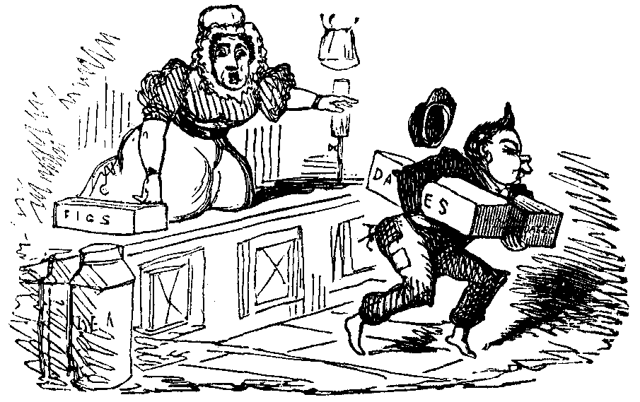 “Yes-Sir,—Tues’y night—Puffs-meets-on-Tues’y,” and then addressing a young girl in the bar, delivered an order for “One-rum-one-bran’y-one gin-no-whisky-all-’ot,” which I afterwards found to signify one glass of each of the liqueurs.