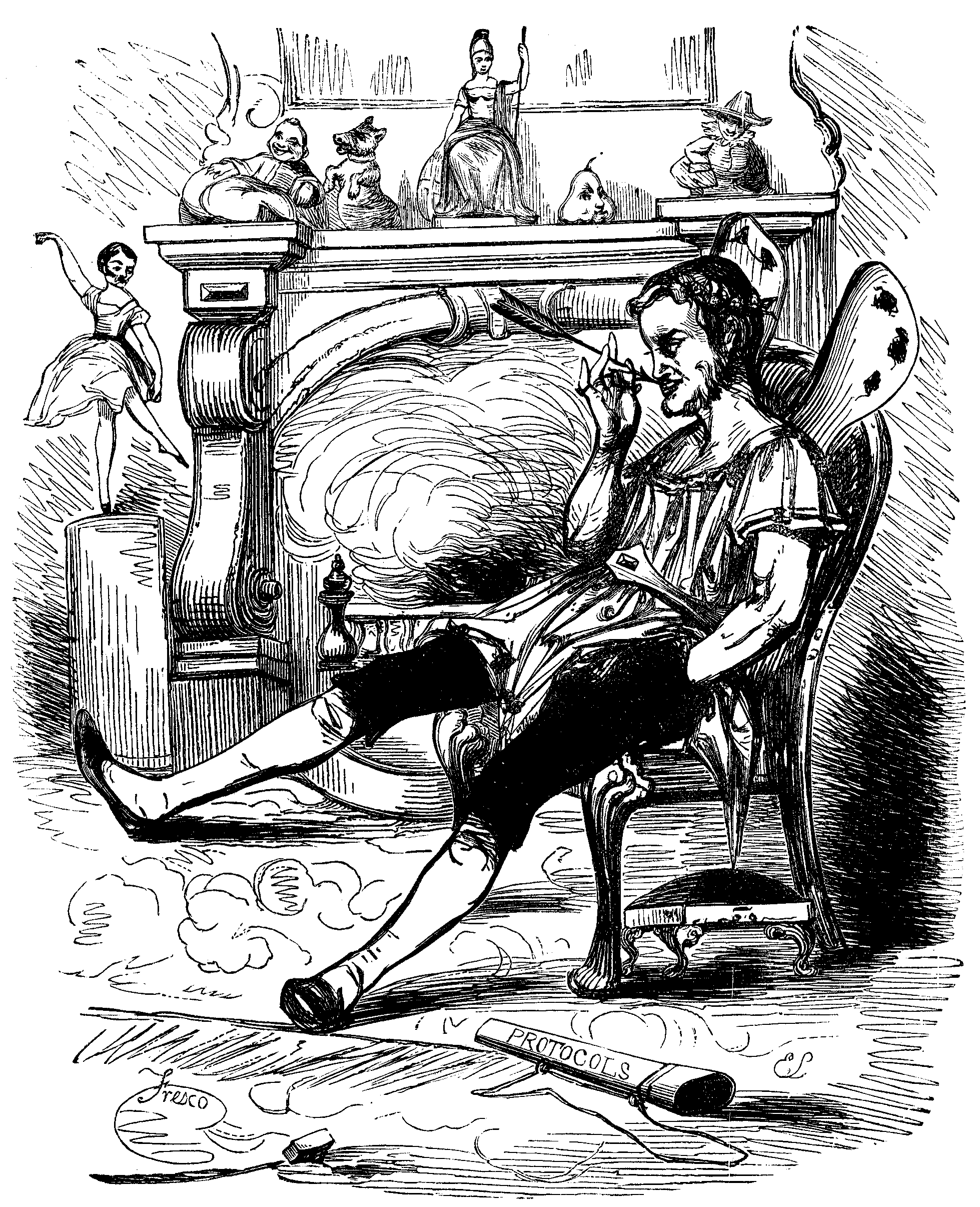 Having expressed the great gratification I should enjoy at being permitted to become a member of so agreeable a society, I was formally presented by the chairman with a capacious meerschaum, richly mounted in silver, and dark with honoured age, filled with choice tobacco, which he informed me was the initiatory pipe to be smoked by every neophyte on his admission amongst the “Puffs.” I shall not attempt to describe with what profound respect I received that venerable tube into my hands—how gently I applied the blazing match to its fragrant contents—how affectionately I placed the amber mouth-piece between my lips, and propelled the thick wreaths of smoke in circling eddies to the ceiling:—to dilate upon all this might savour of an egotistical desire to exalt my own merits—a species of puffing I mortally abhor. Suffice it to say, that when I had smoked the pipe of peace, I was heartily congratulated by the chairman and the company generally upon the manner in which I had acquitted myself, and I was declared without a dissentient voice a duly-elected member of the “Puffs.”