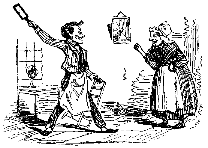 During the preceding conversation, Mr. Muff cuts down the victim with a scalpel; and, finding that life has departed, commences to pluck it, and perform the usual post-mortem abdominal examinations attendant upon such occasions. Mr. Rapp undertakes to manufacture an extempore spit, from the rather dilapidated umbrella of the new Scotch pupil, which he has heedlessly left in the dissecting-room. This being completed, with the assistance of some wire from the ribs of an old skeleton that had hung in a corner of the room ever since it was built, the hen is put down to roast, presenting the most extraordinary specimen of trussing upon record. Mr. Jones undertakes to buy some butter at a shop behind the hospital; and Mr. Manhug, not being able to procure any flour, gets some starch from the cabinet of the lecturer on Materia Medica, and powders it in a mortar which he borrows from the laboratory.