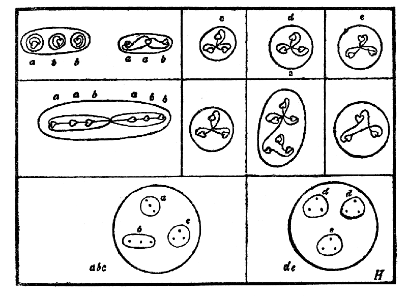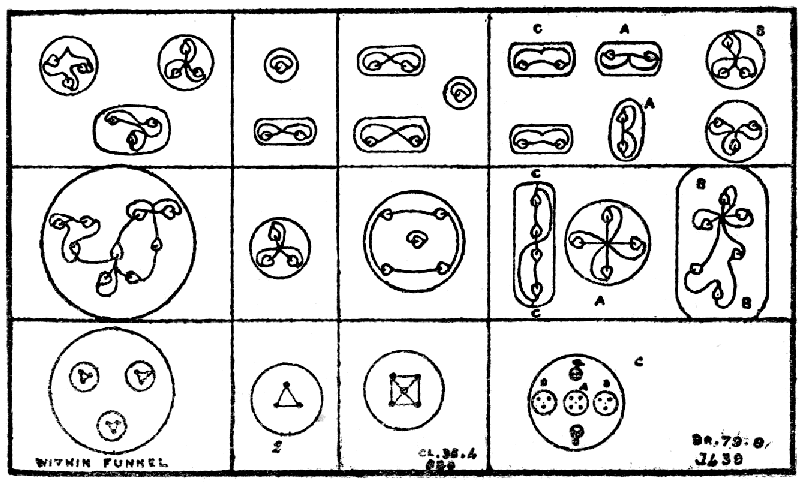 In order to examine the construction of the atom, a space is artificially made[9]; then, if an opening be made in the wall thus constructed, the surrounding force flows in, and three whorls immediately appear, surrounding the "hole" with their triple spiral of two and a half coils, and returning to their origin by a spiral within the atom; these are at once followed by seven finer whorls, which following the spiral of the first three on the outer surface, and returning to their origin by a spiral within that, flowing in the opposite direction—form a caduceus with the first three. Each of the three coarser whorls, flattened out, makes a closed circle; each of the seven finer ones, similarly flattened out, makes a closed circle. The forces which flow in them, again, come from "outside," from a fourth-dimensional space.[10] Each of the finer whorls is formed of seven yet finer ones, set successively at right angles to each other, each finer than its predecessor; these we call spirillæ.[11]