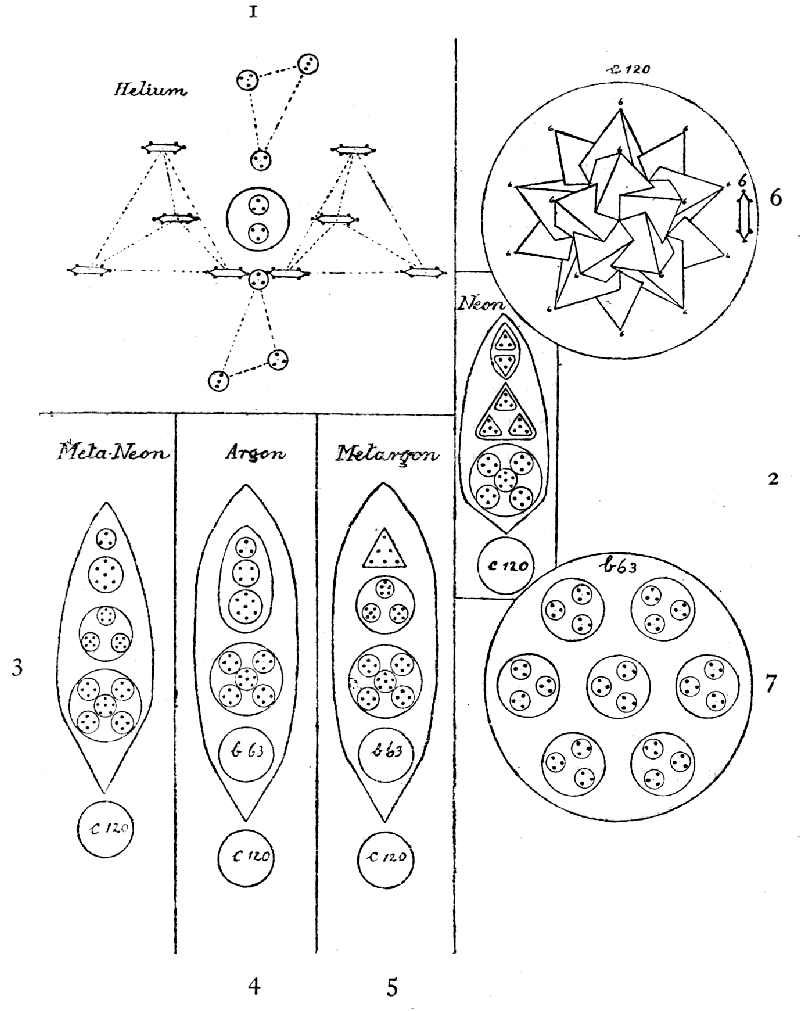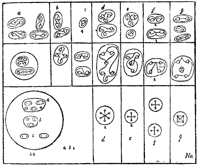 The first difficulty that faced us was the identification of the forms seen on focusing the sight on gases.[2] We could only proceed tentatively. Thus, a very common form in the air had a sort of dumb-bell shape (see Plate I); we examined this, comparing our rough sketches, and counted its atoms; these, divided by 18—the number of ultimate atoms in hydrogen—gave us 23.22 as atomic weight, and this offered the presumption that it was sodium. We then took various substances—common salt, etc.—in which we knew sodium was present, and found the dumb-bell form in all. In other cases, we took small fragments of metals, as iron, tin, zinc, silver, gold; in others, again, pieces of ore, mineral waters, etc., etc., and, for the rarest substances, Mr. Leadbeater visited a mineralogical museum. In all, 57 chemical elements were examined, out of the 78 recognized by modern chemistry.